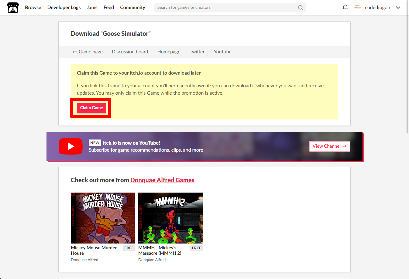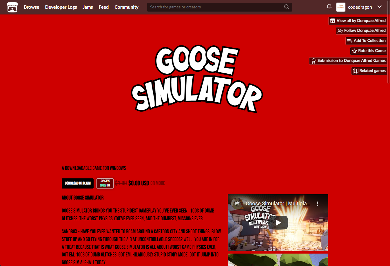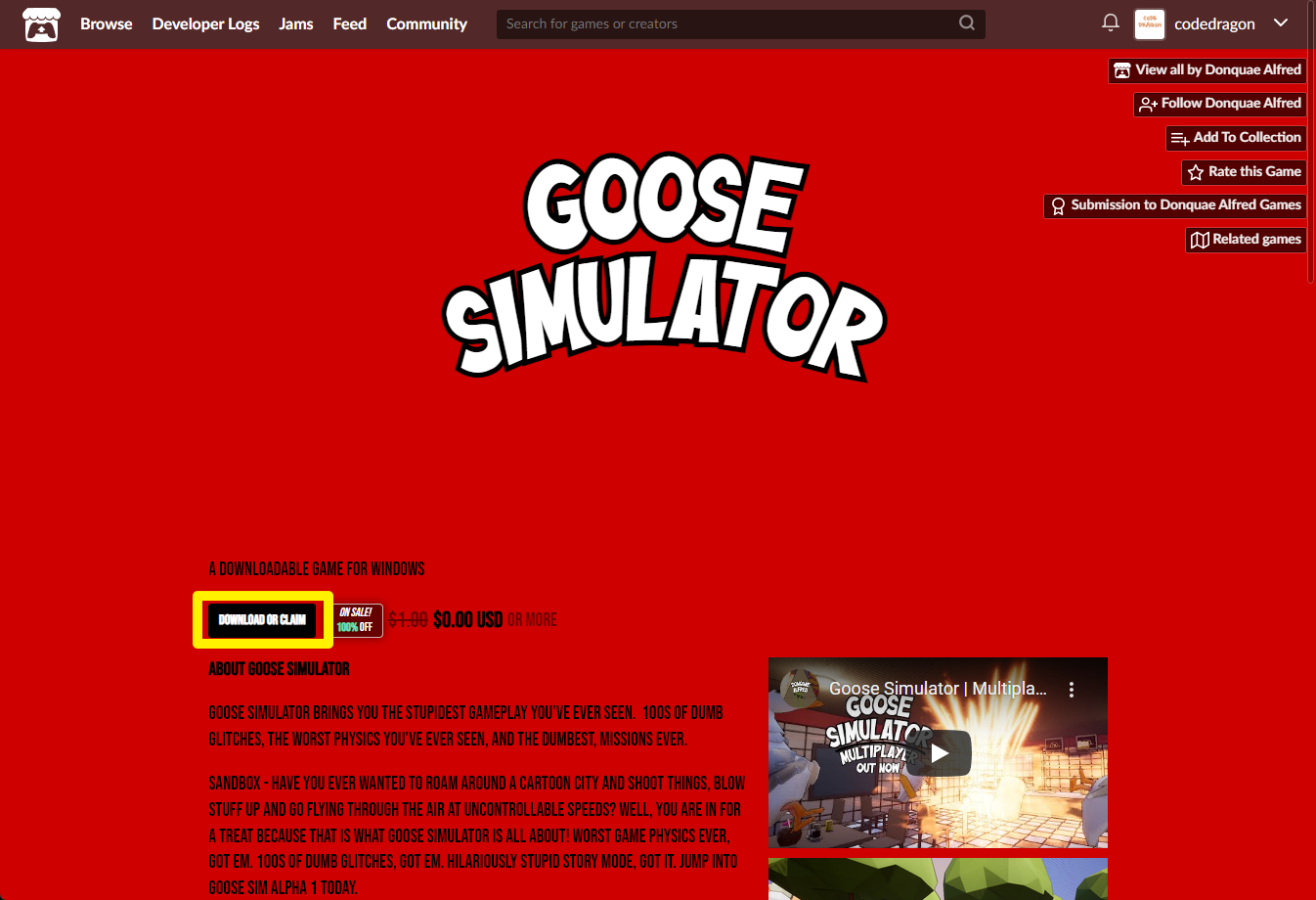 "Goose Simulator" 페이지에 있는 [Download or claim]을 클릭합니다.