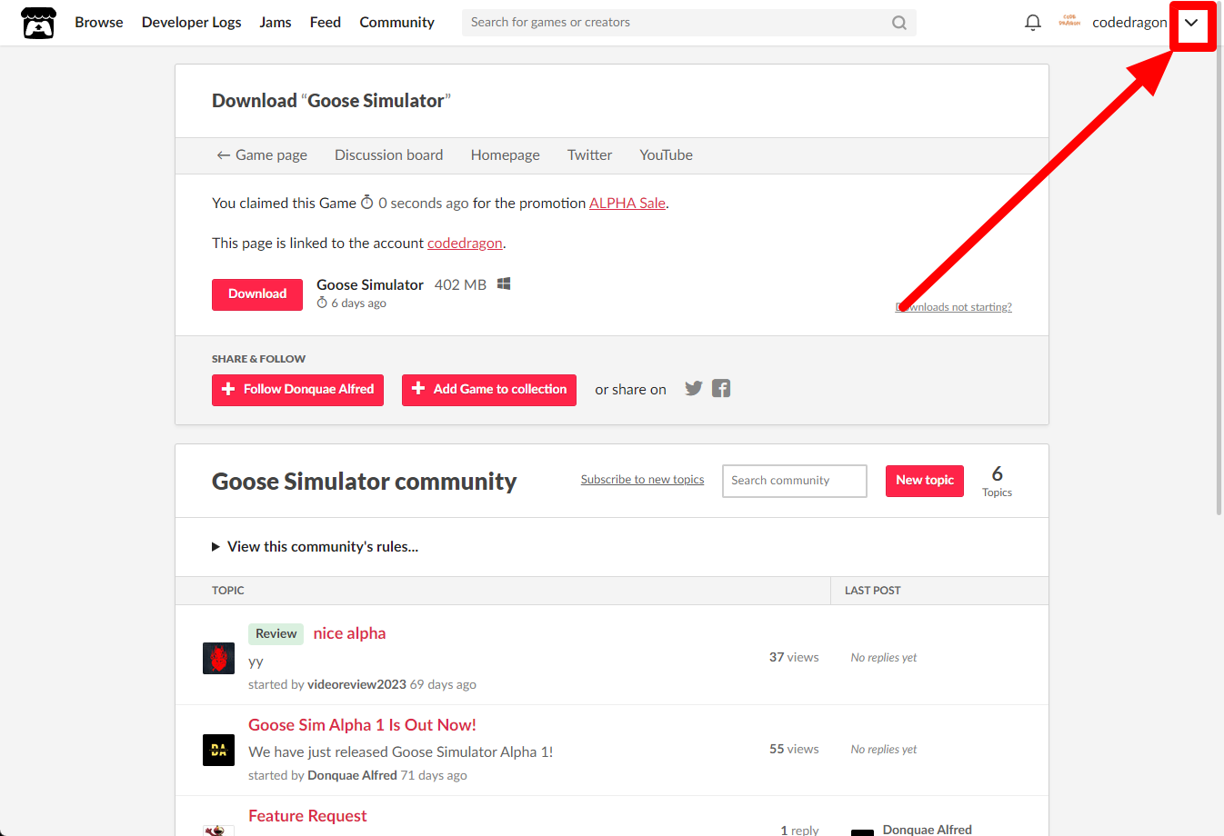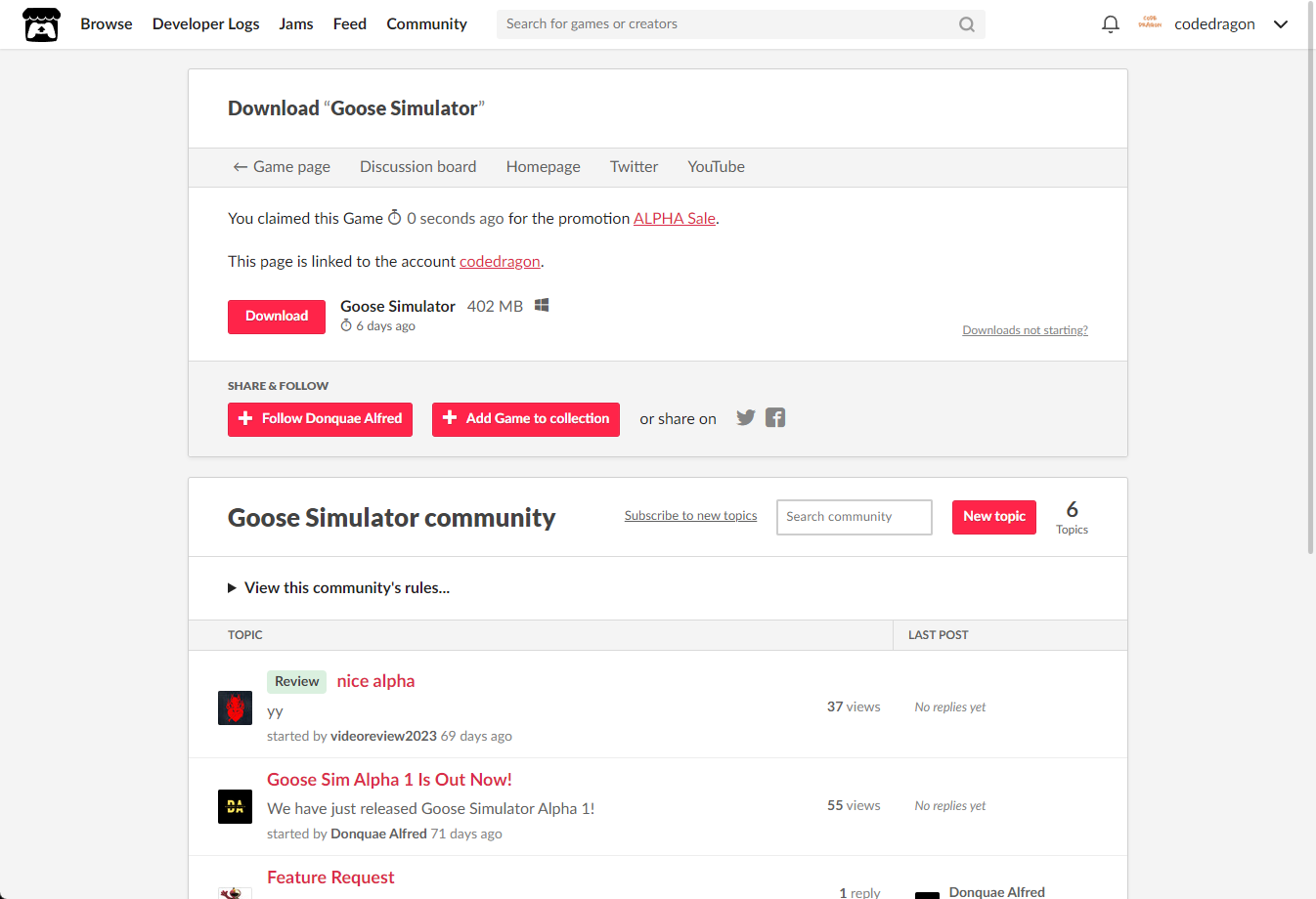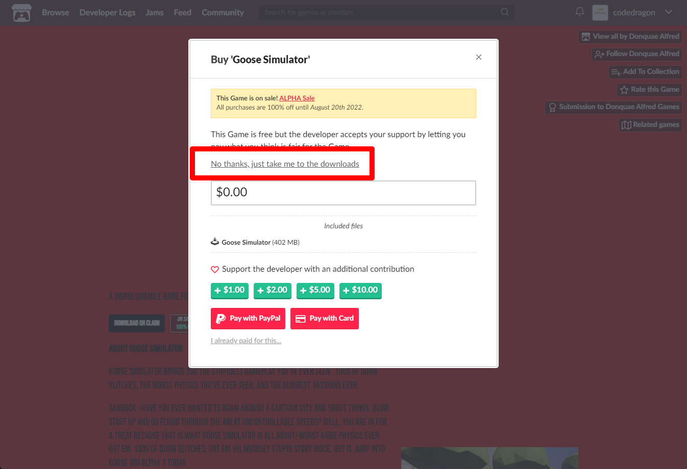 "Goose Simulator" 페이지에 있는 [Download or claim]을 클릭합니다.