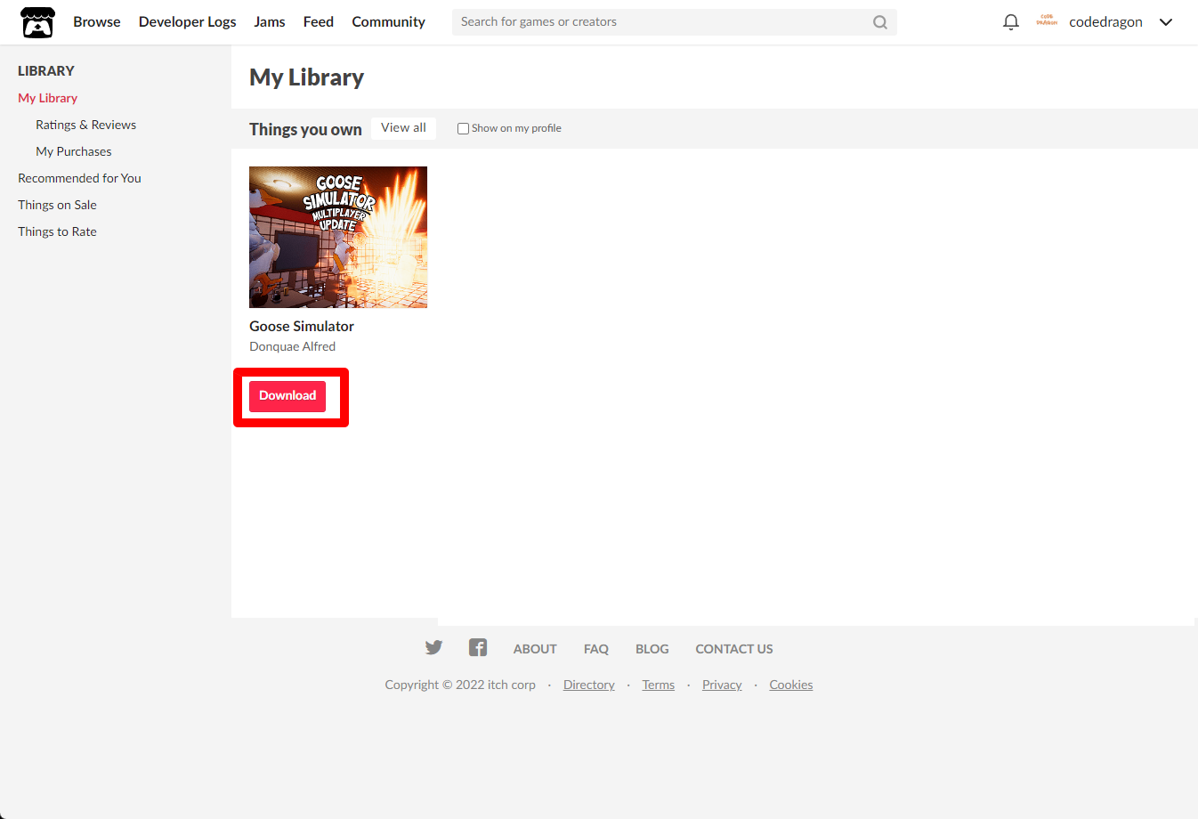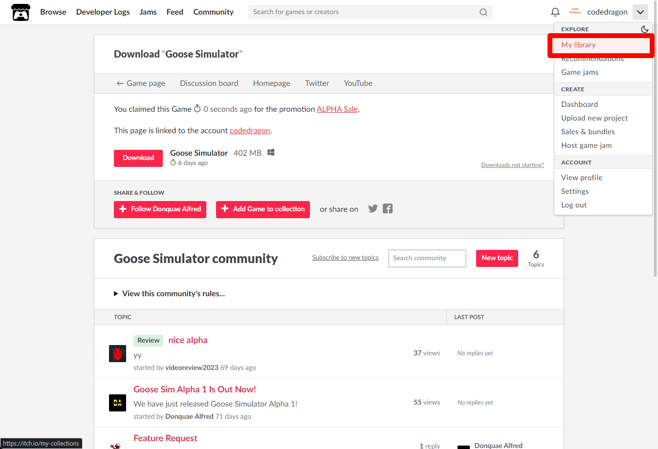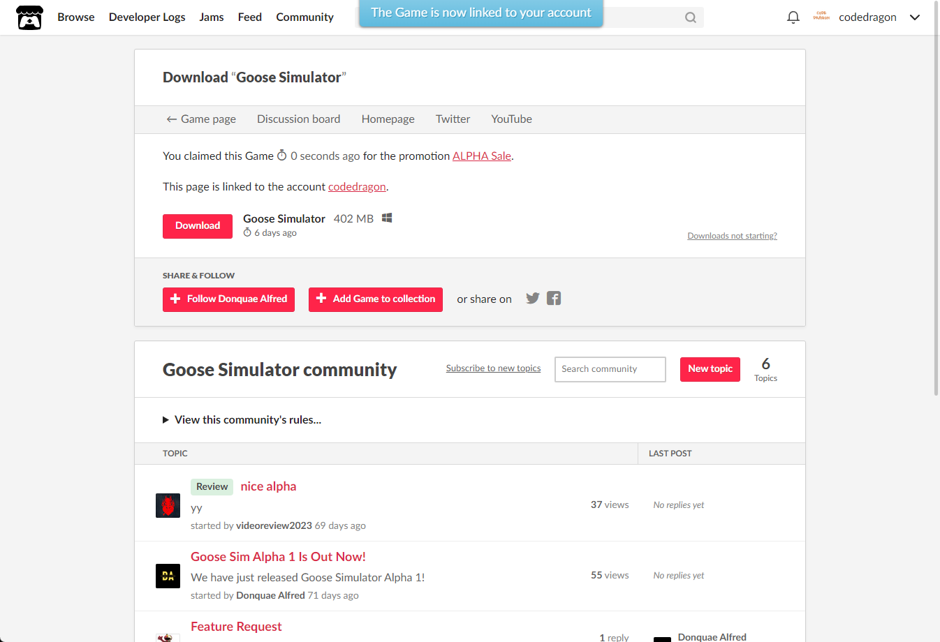 [Claim game]을 클릭하면 "Goose Simulator" 게임이 나의 게임 라이브러리에 추가되고 설치파일을 다운받을 수 있는 페이지로 이동됩니다.