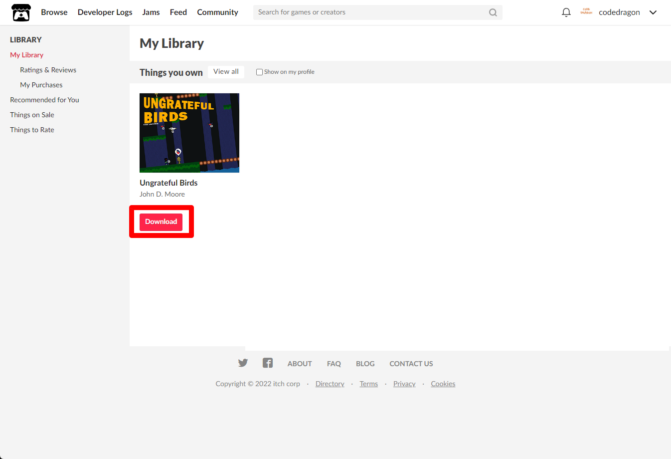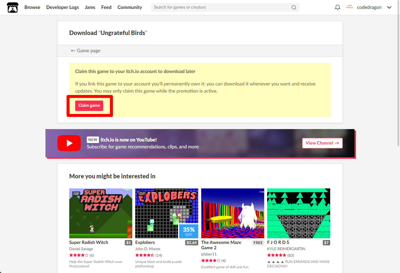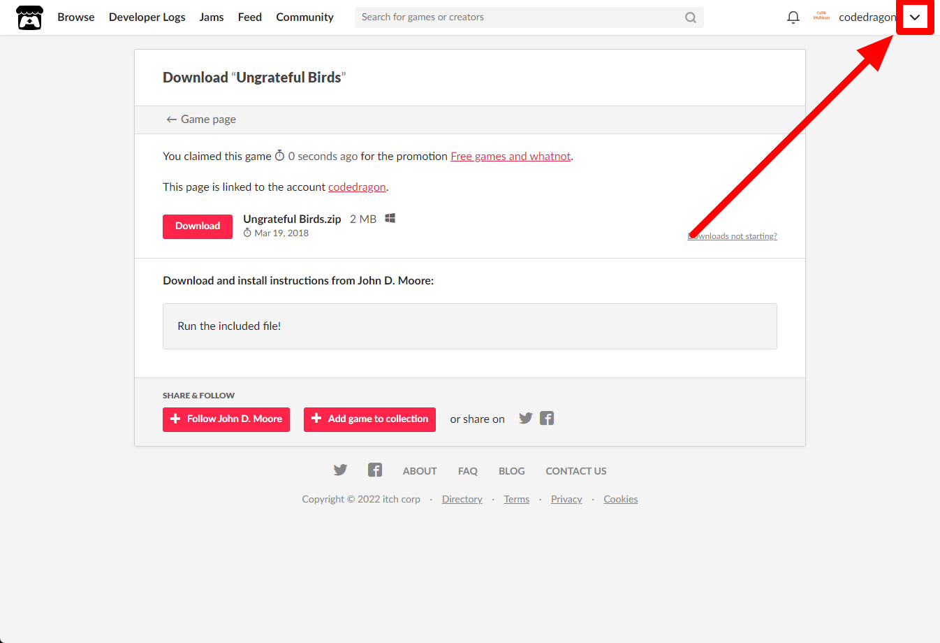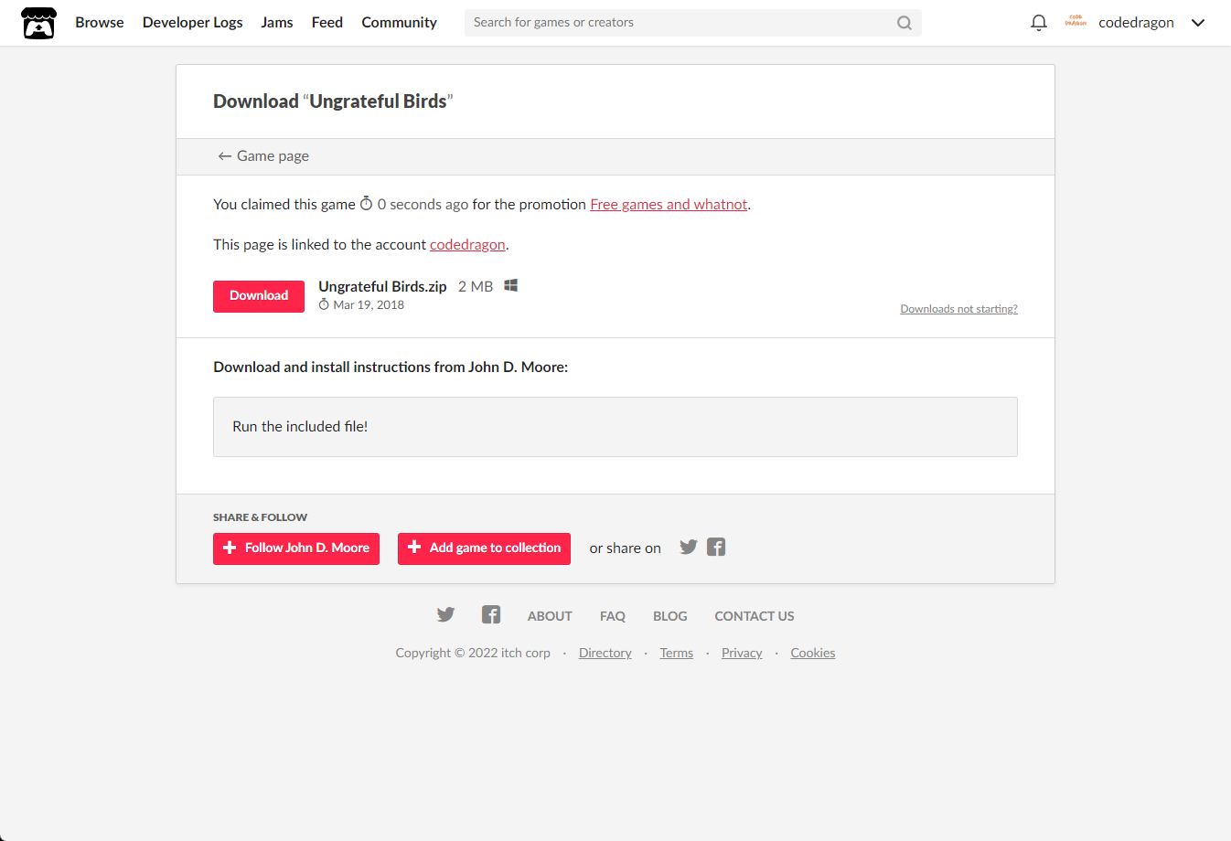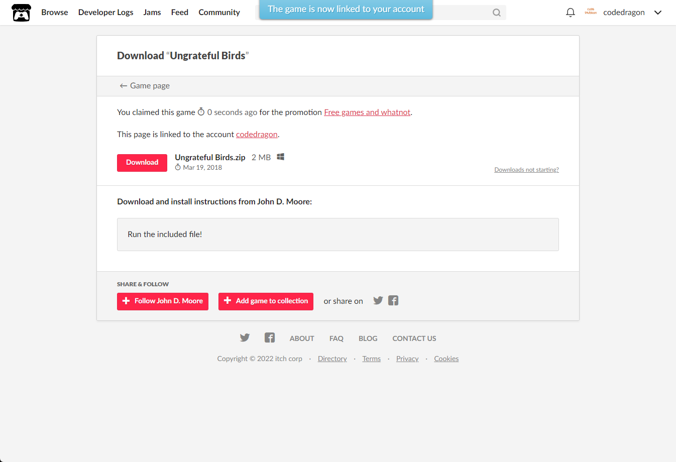 [Claim game]을 클릭하면 "Ungrateful Birds" 게임이 나의 게임 라이브러리에 추가되고 설치파일을 다운받을 수 있는 페이지로 이동됩니다.