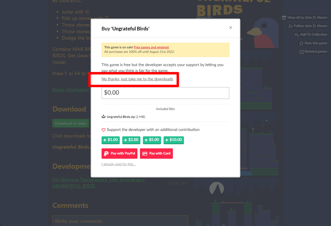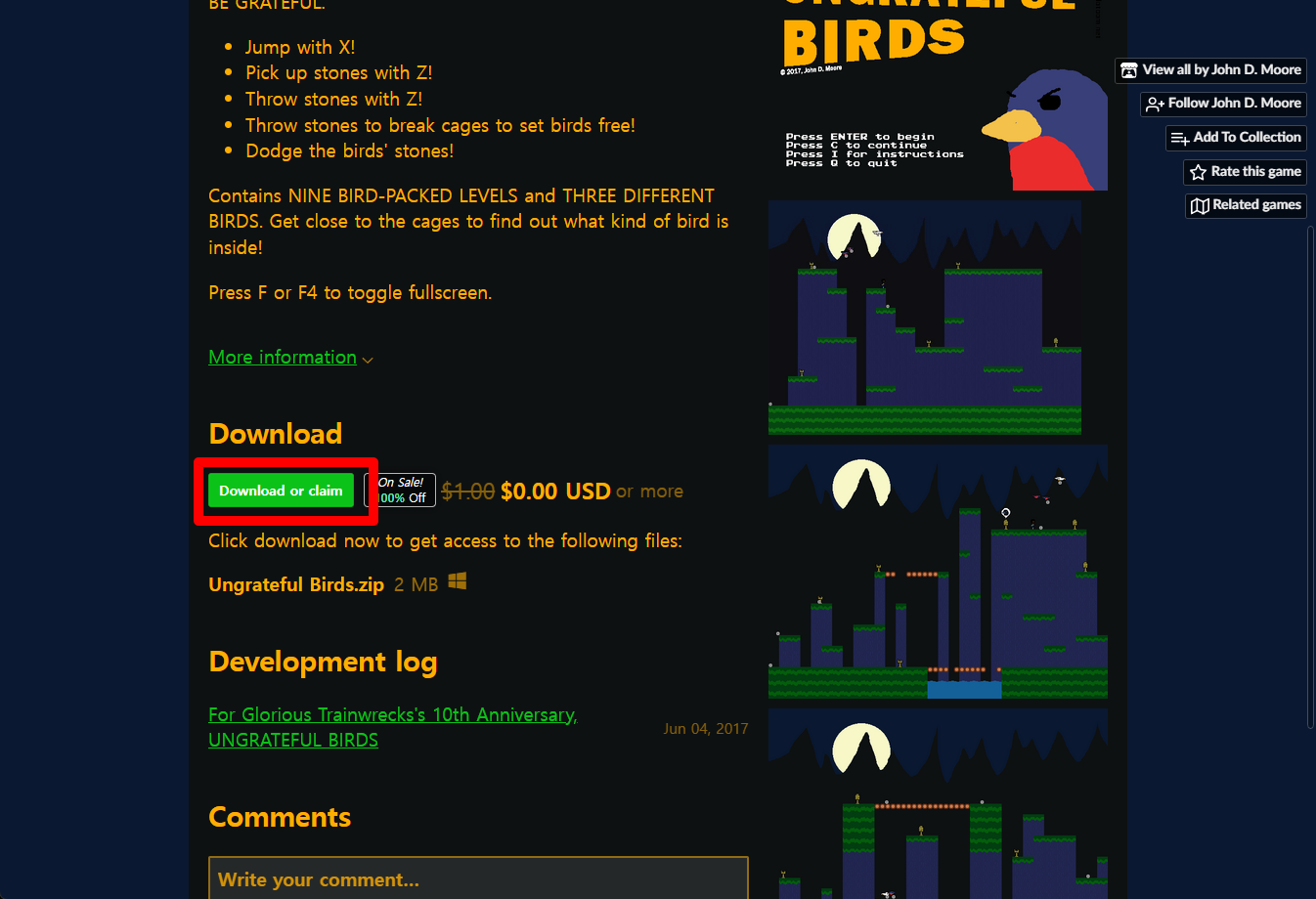 "Ungrateful Birds" 페이지 내려서 [Download or claim]을 클릭합니다.