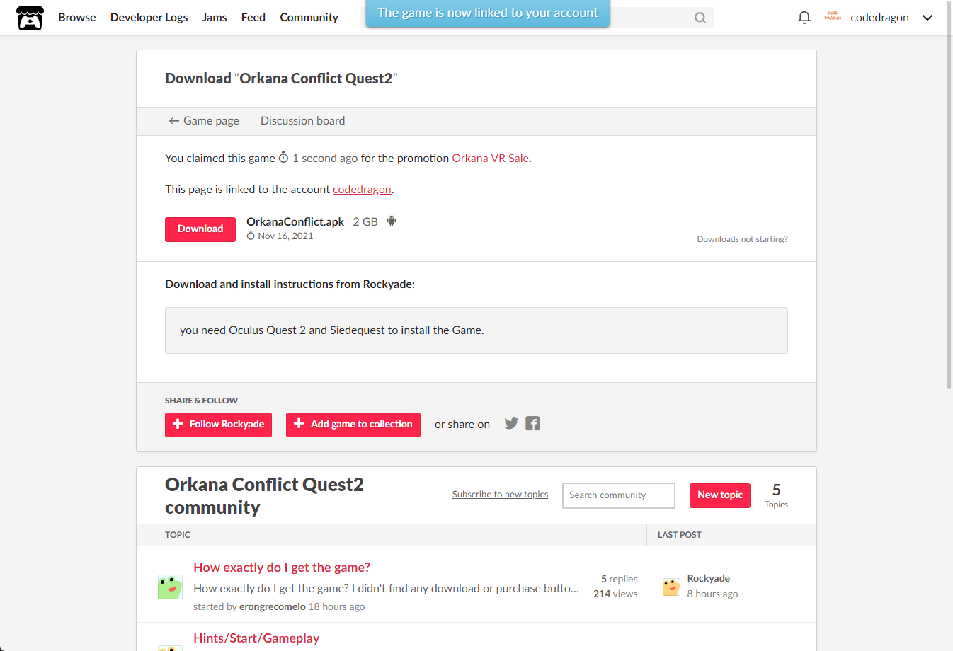 [Claim game]을 클릭하면 "Orkana Conflict Quest2" 게임이 나의 게임 라이브러리에 추가되고 설치파일을 다운받을 수 있는 페이지로 이동됩니다.
