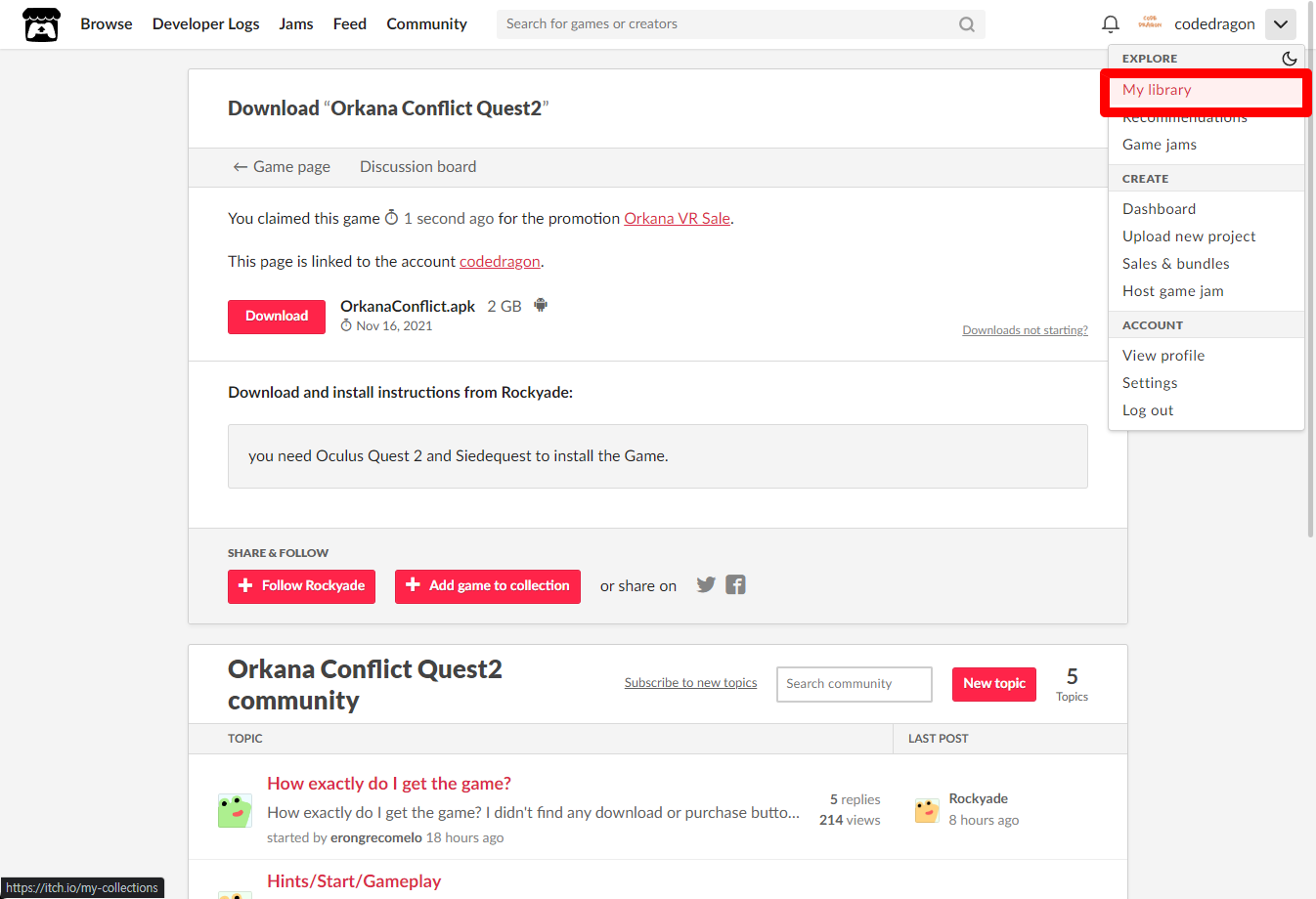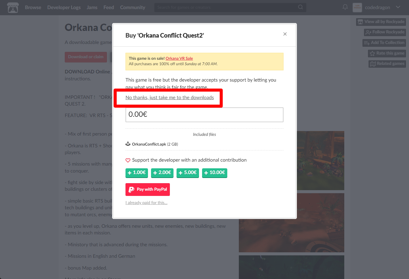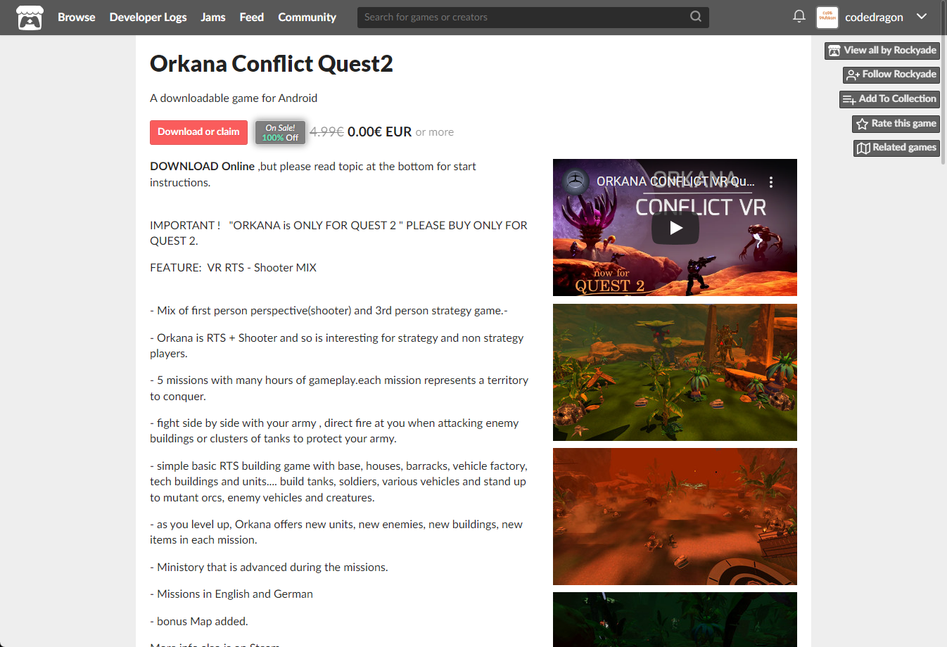 "Orkana Conflict Quest2" 페이지에 있는 [Download or claim]을 클릭합니다.