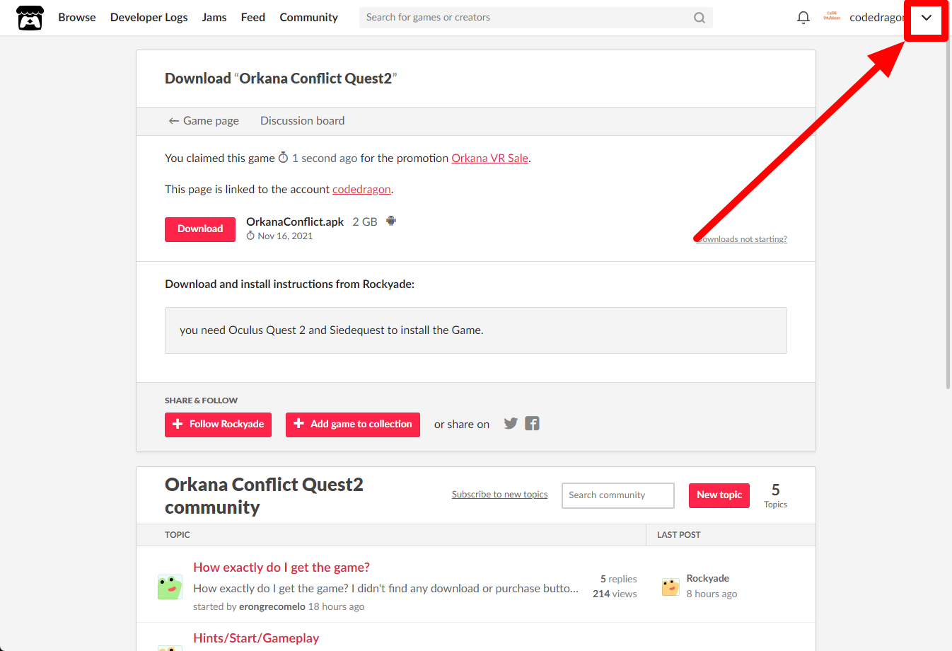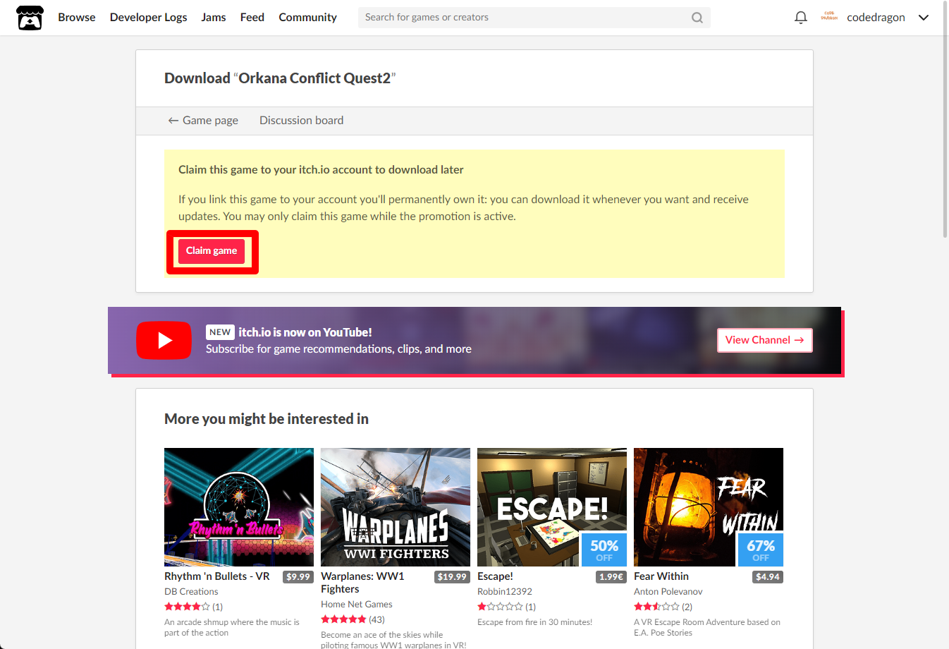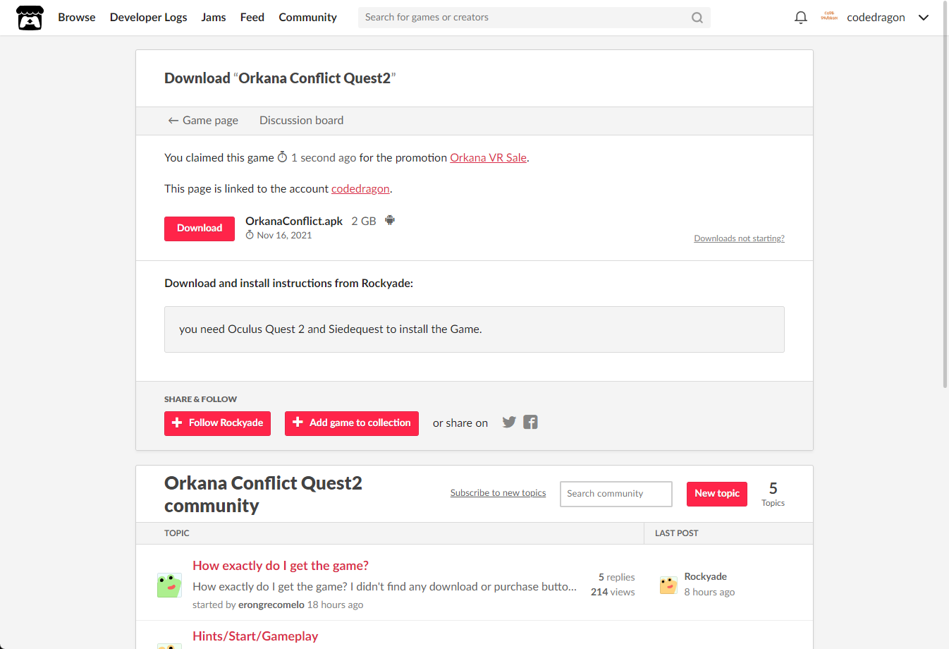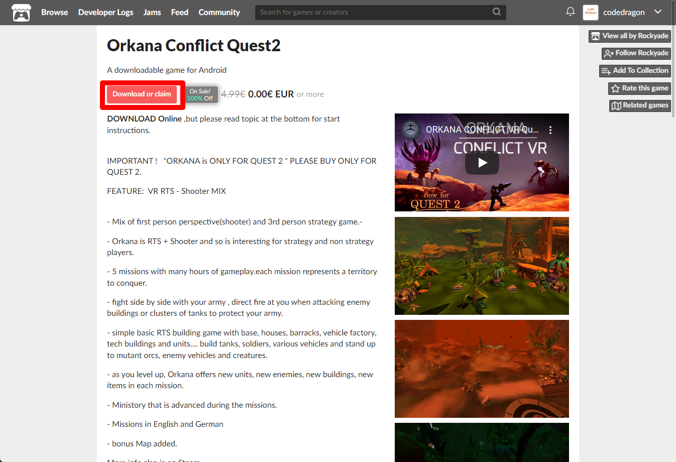 "Orkana Conflict Quest2" 페이지에 있는 [Download or claim]을 클릭합니다.