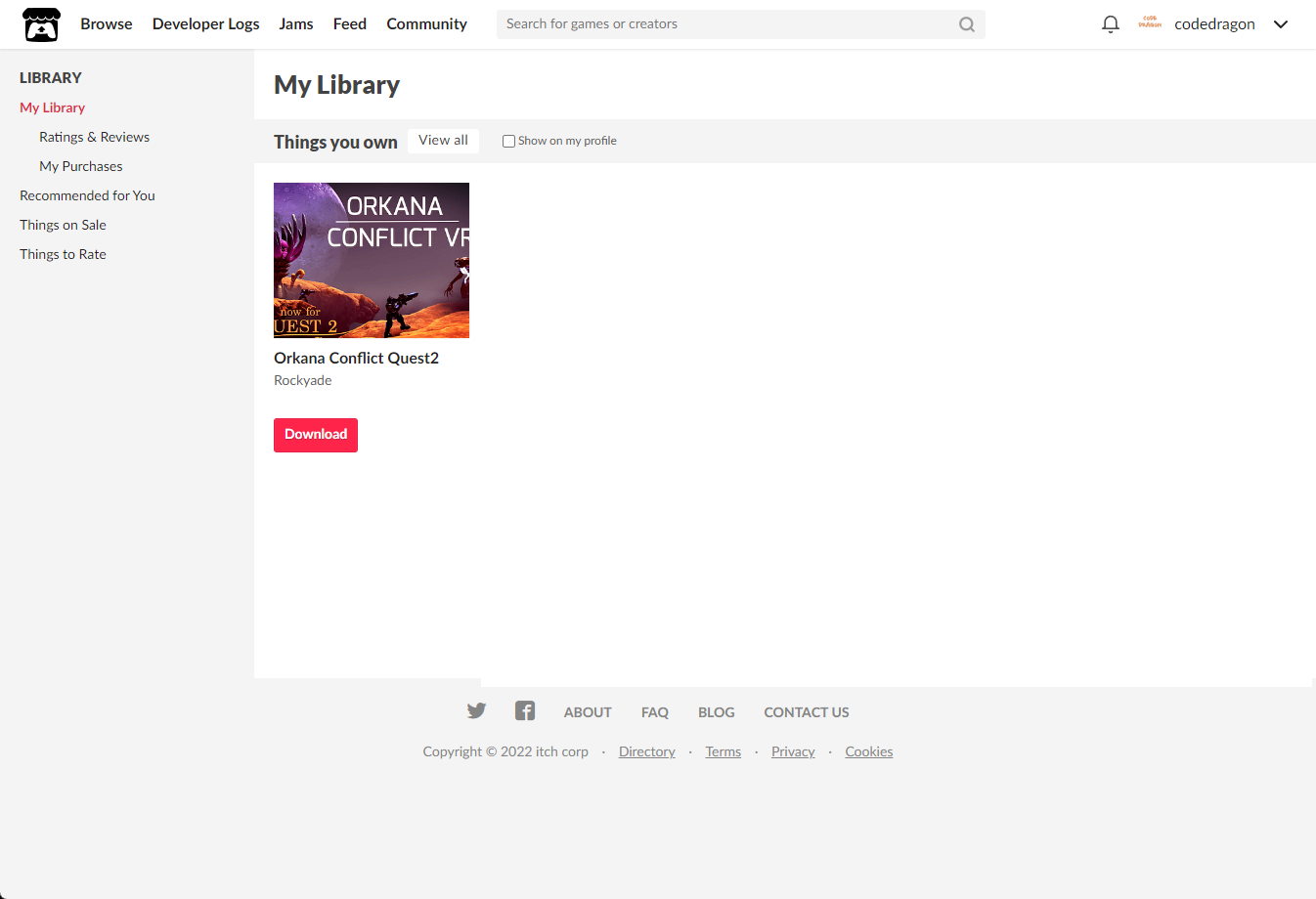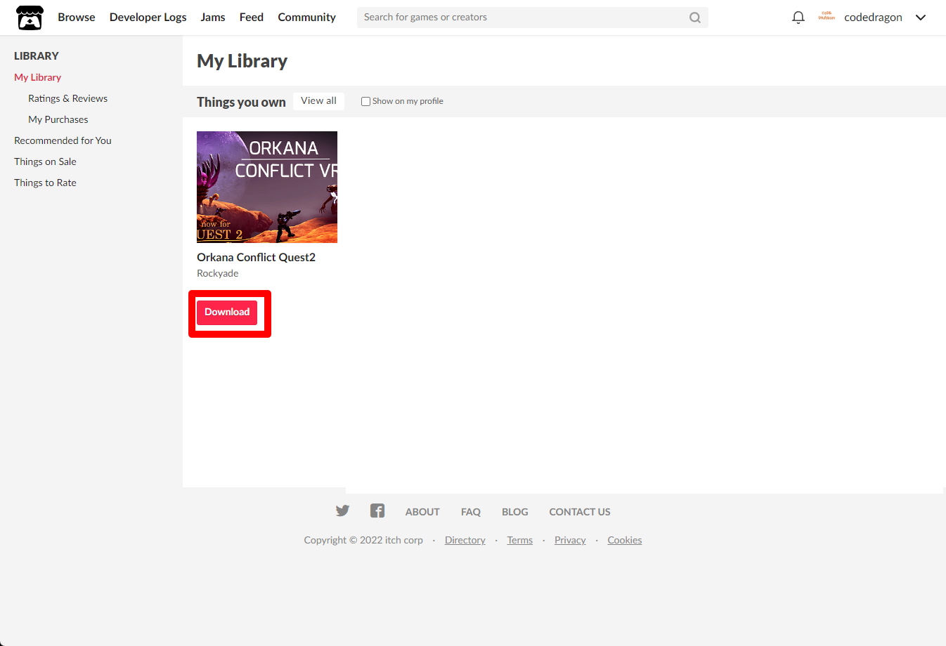 [Claim game]을 클릭하면 "Orkana Conflict Quest2" 게임이 나의 게임 라이브러리에 추가되고 설치파일을 다운받을 수 있는 페이지로 이동됩니다.