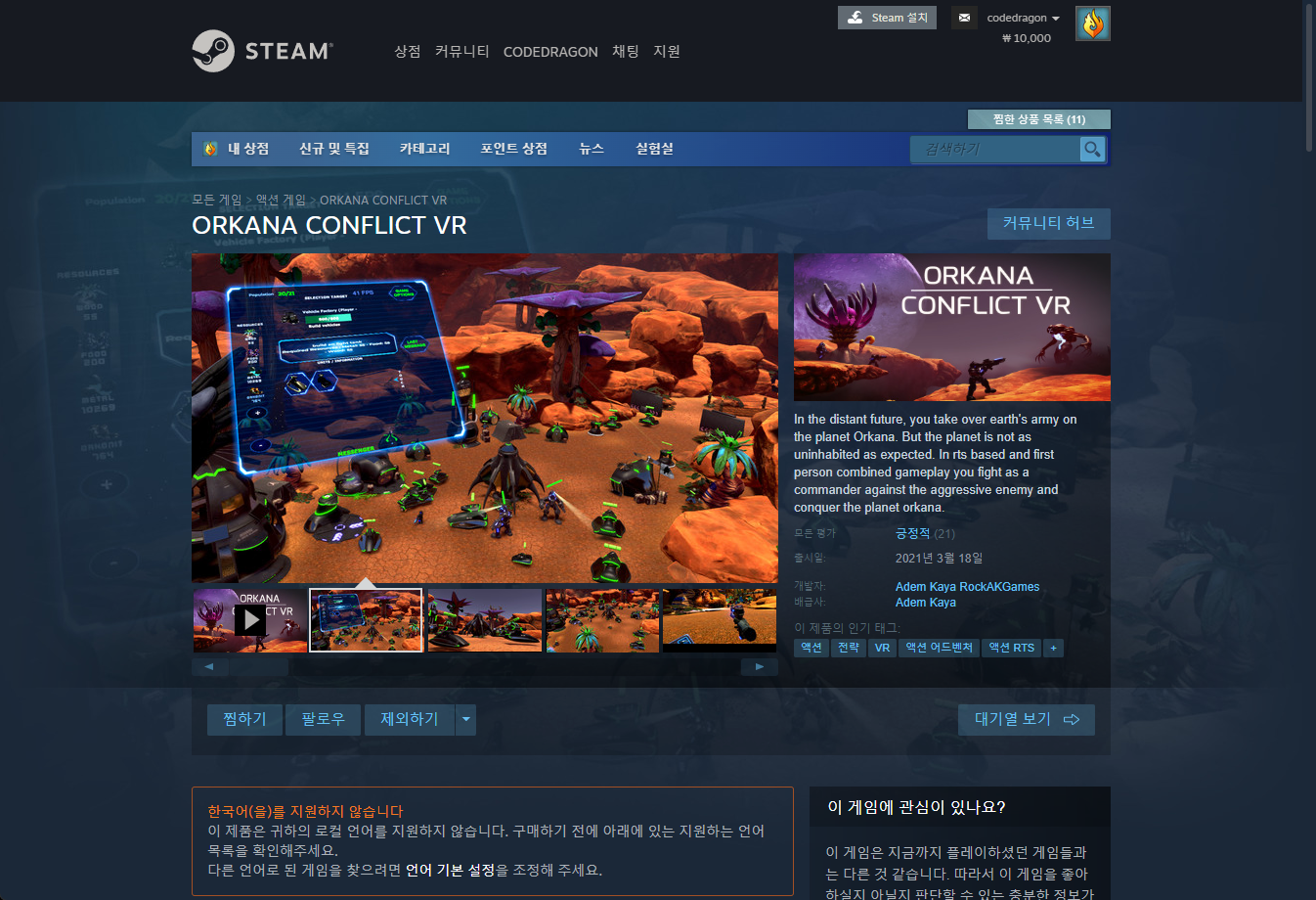 "Orkana Conflict Quest2" 스팀 Steam 페이지