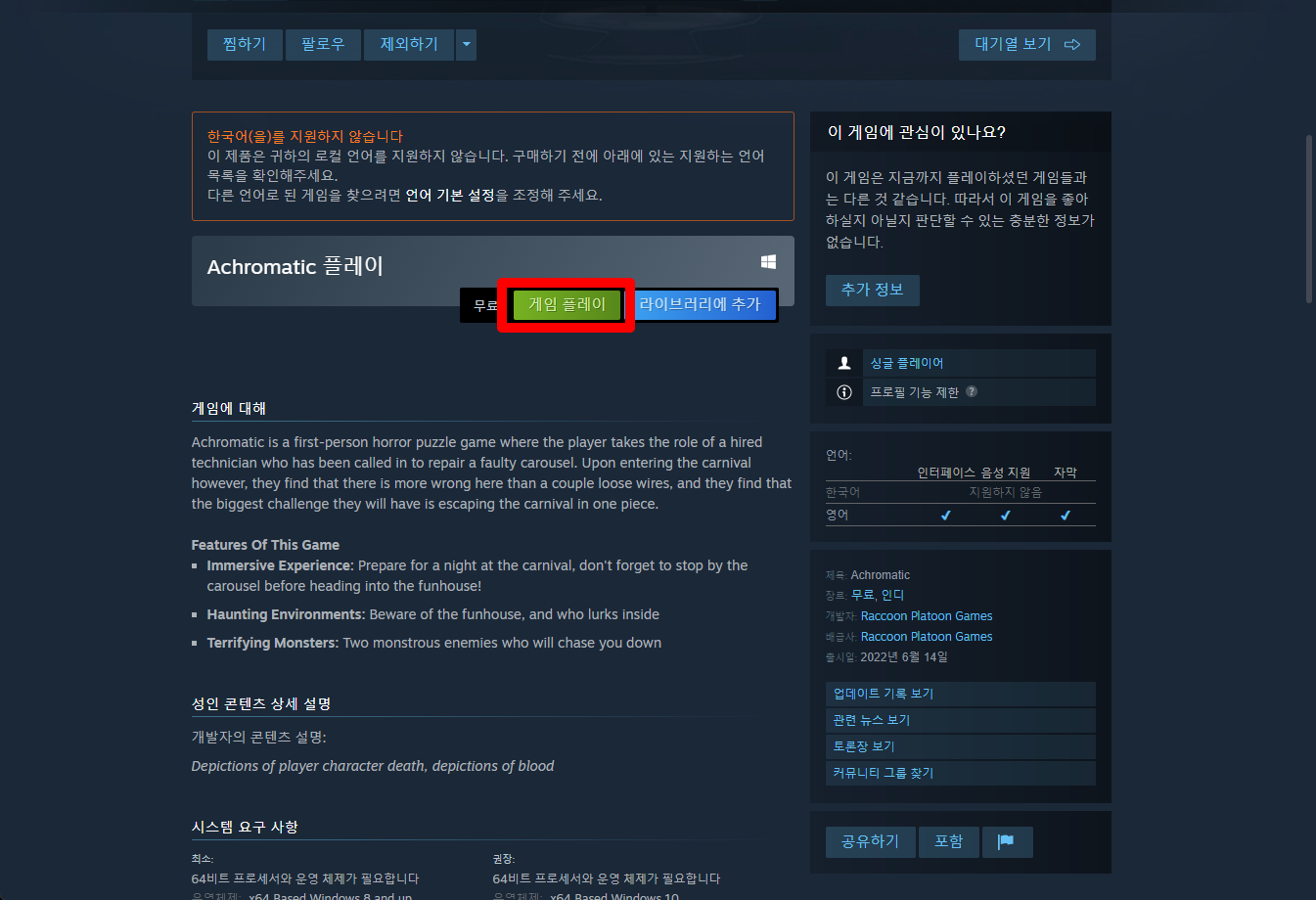 "Achromatic" 스팀 페이지 입니다.