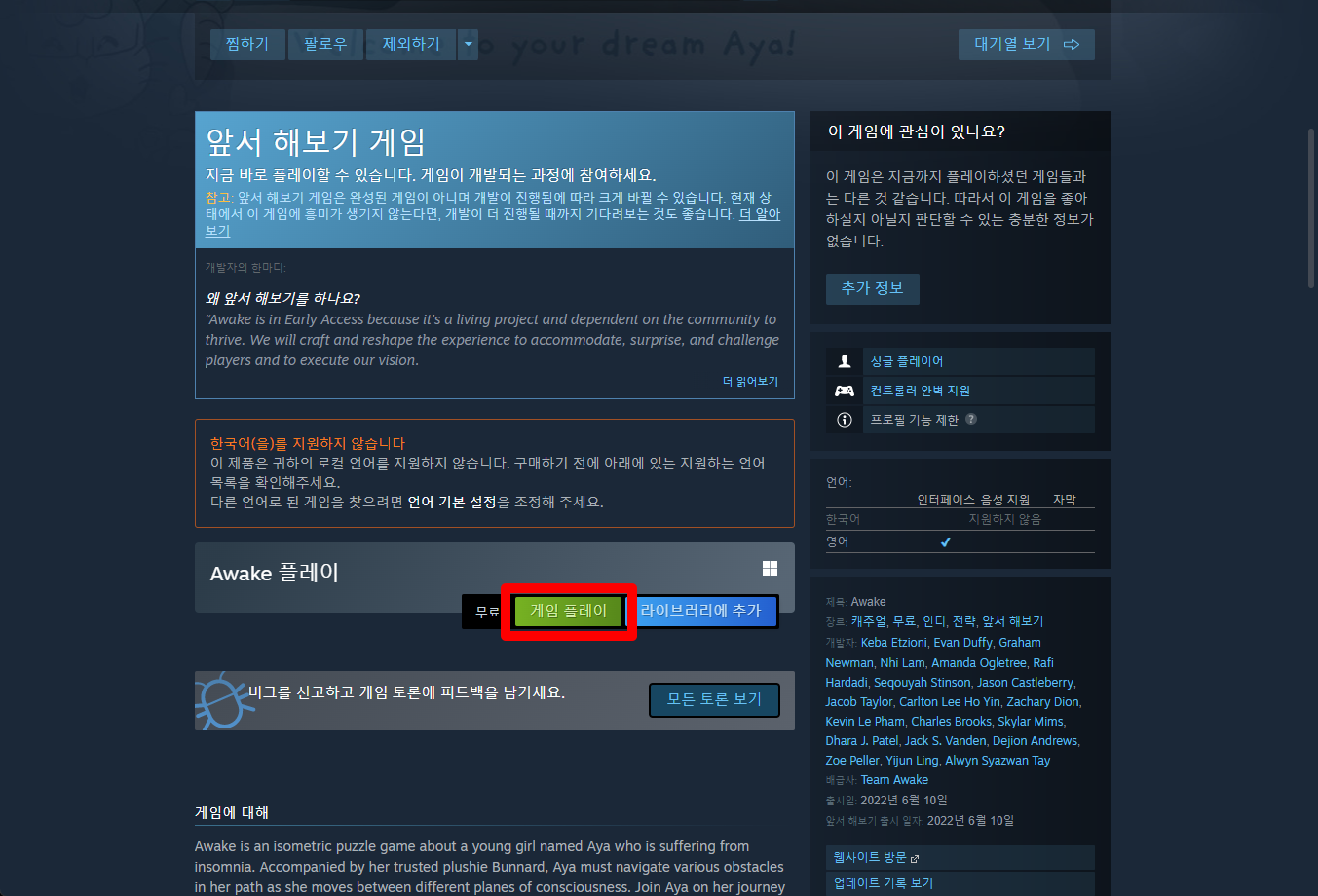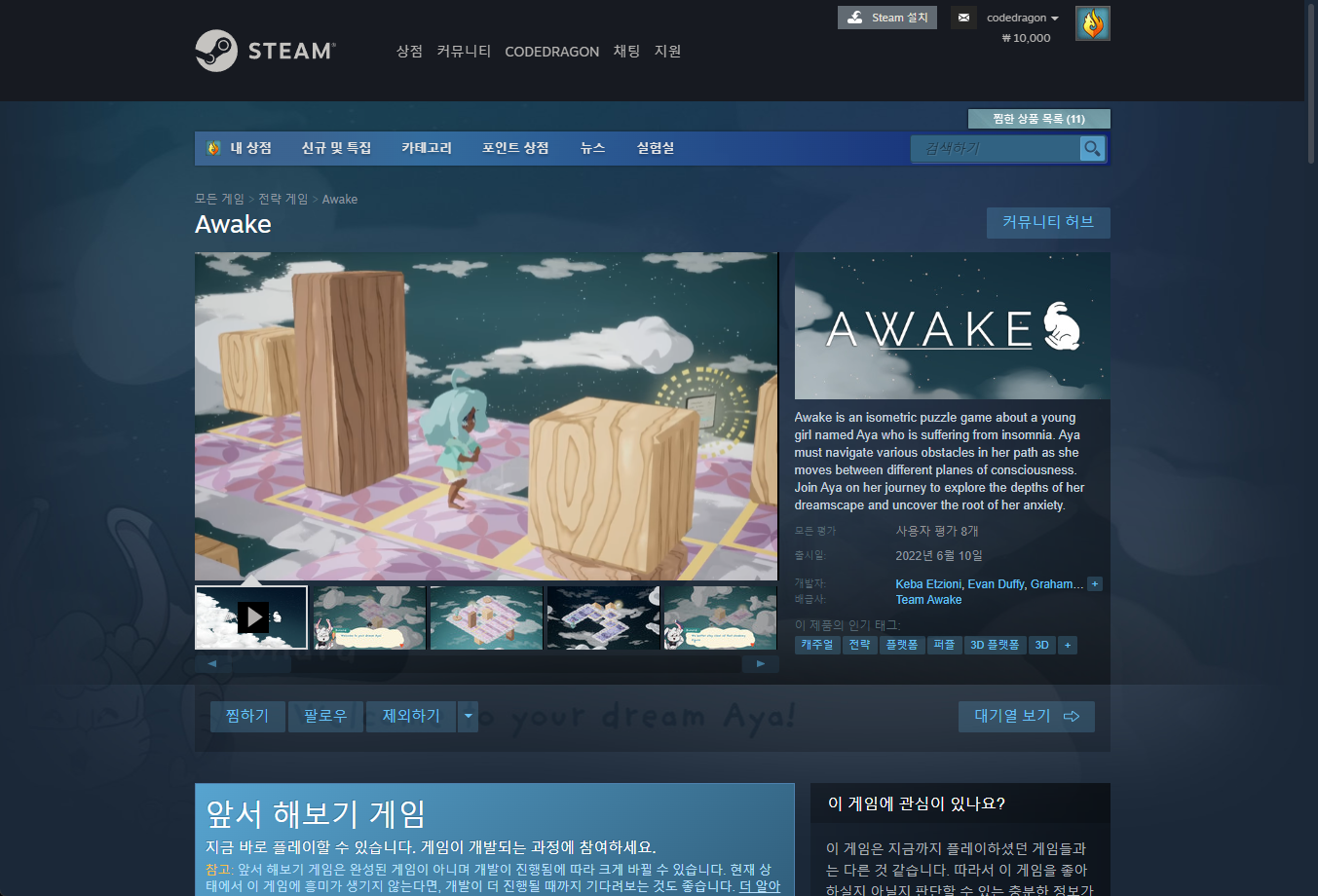 "Awake" 스팀 페이지 입니다.