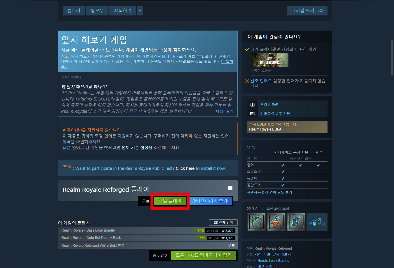 "Realm Royale Reforged" 페이지를 내려 [게임 플레이]를 클릭하면 됩니다.