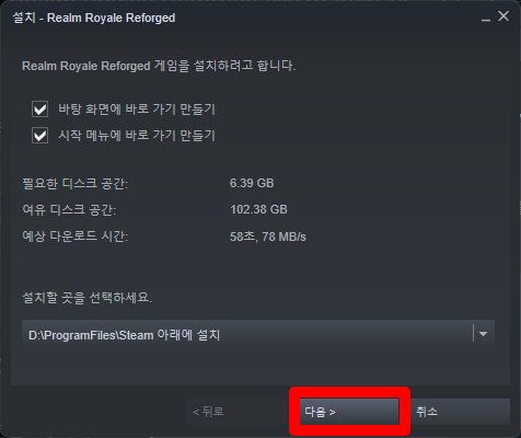 Steam 런처가 실행되면 원하는 위치에 "Realm Royale Reforged" 게임 설치를 완료해 줍니다.