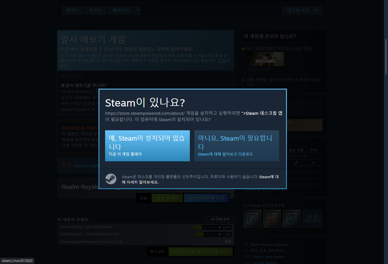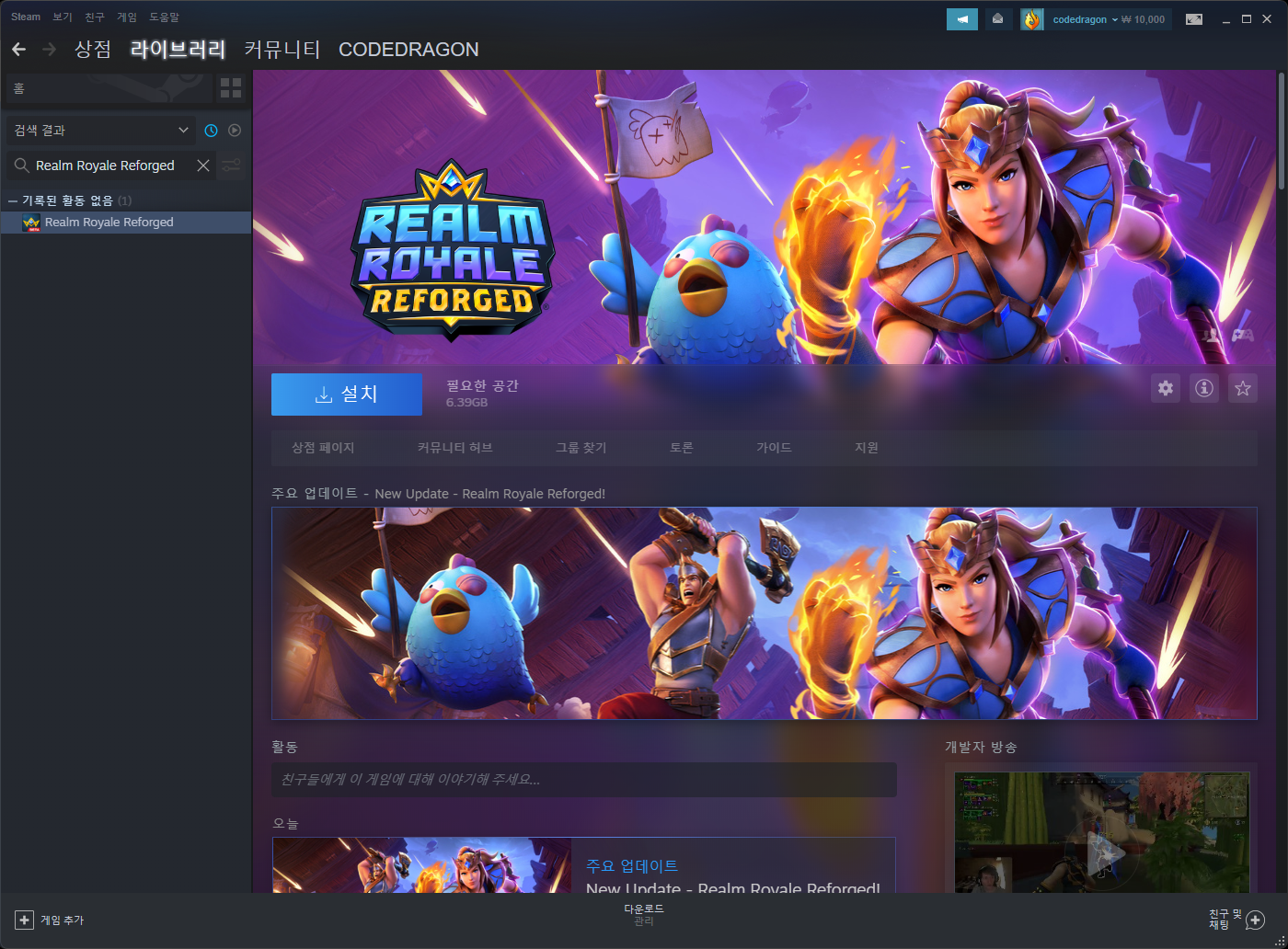 Steam 런처가 실행되면 원하는 위치에 "Realm Royale Reforged" 게임 설치를 완료해 줍니다.