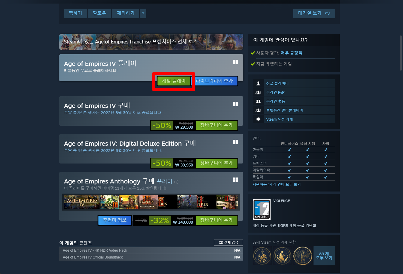 "Age of Empires IV" 게임페이지를 조금 내려서 [게임 플레이] 버튼을 클릭하면 됩니다.