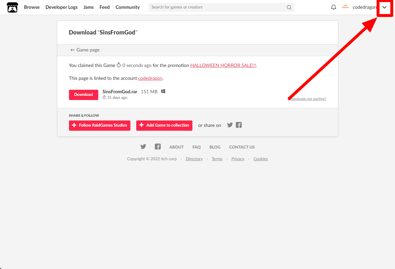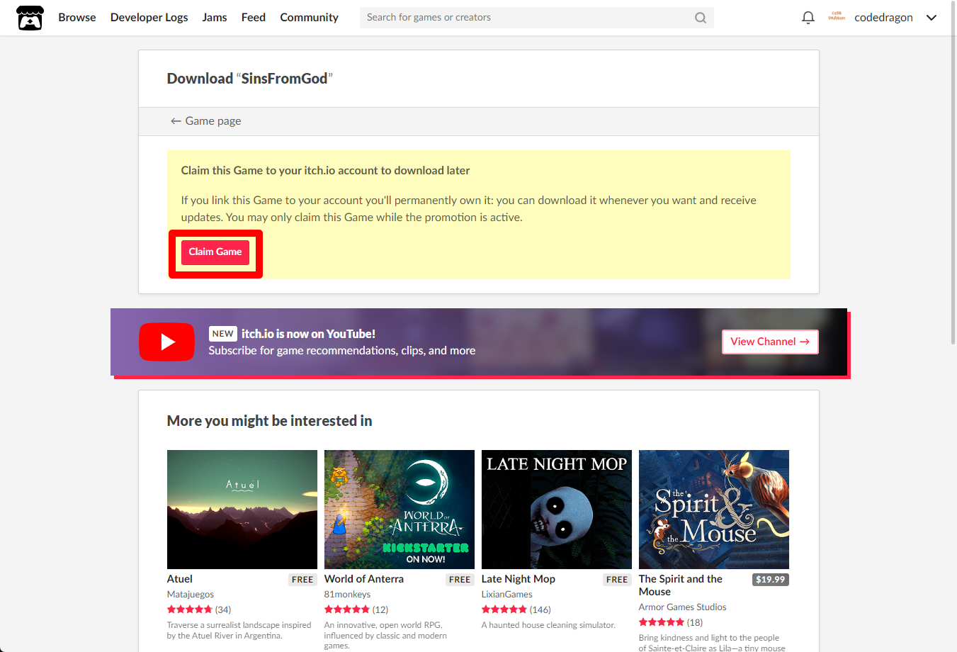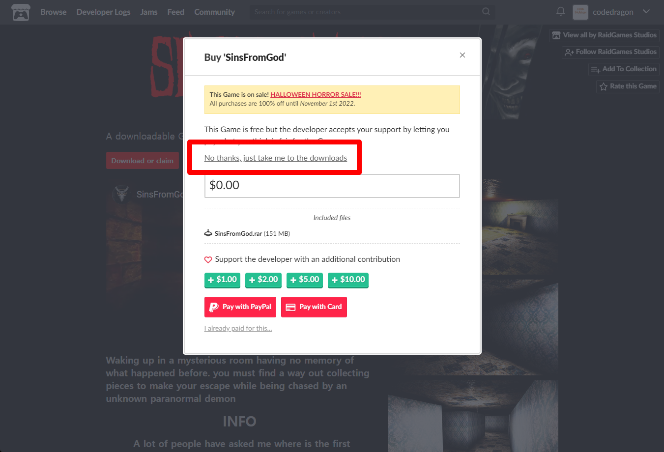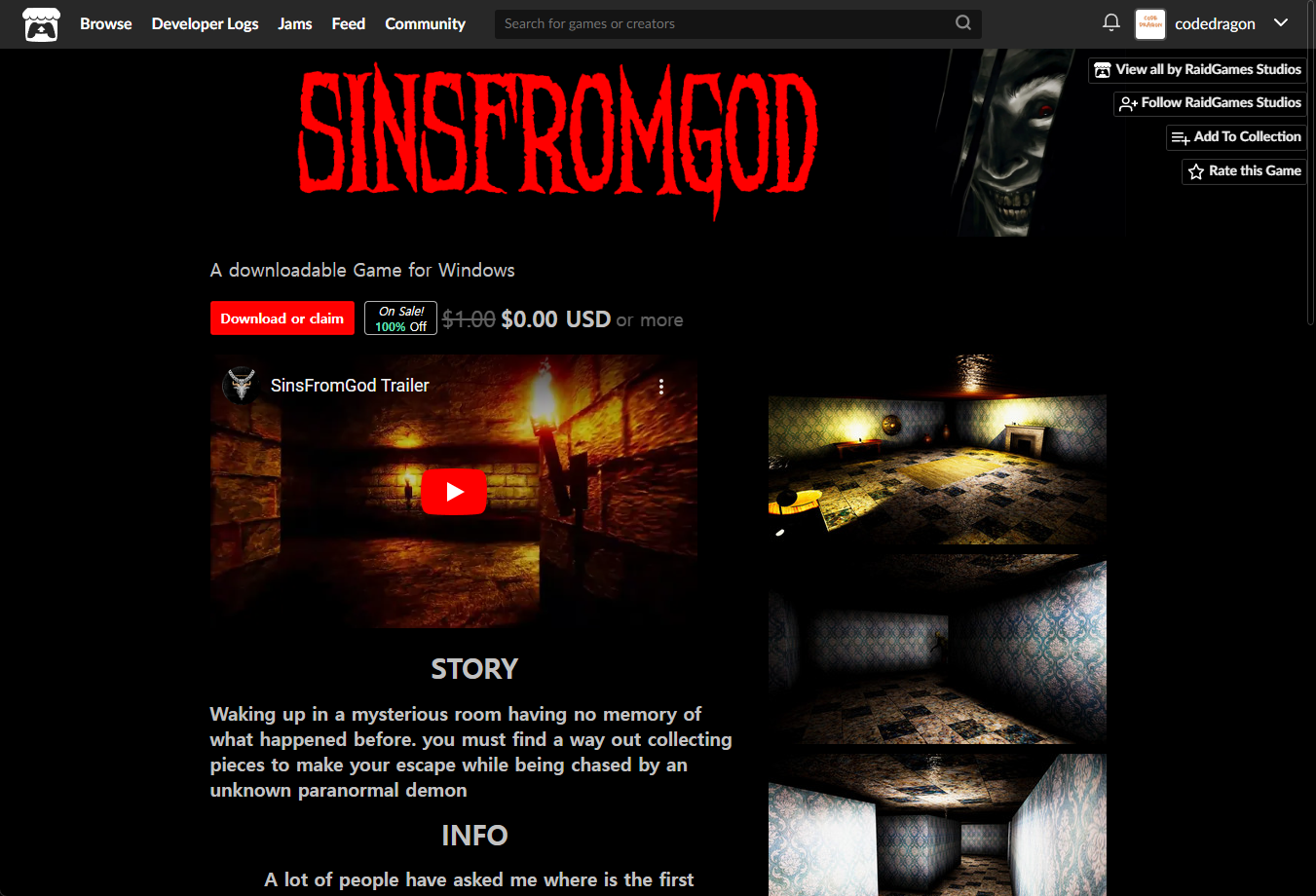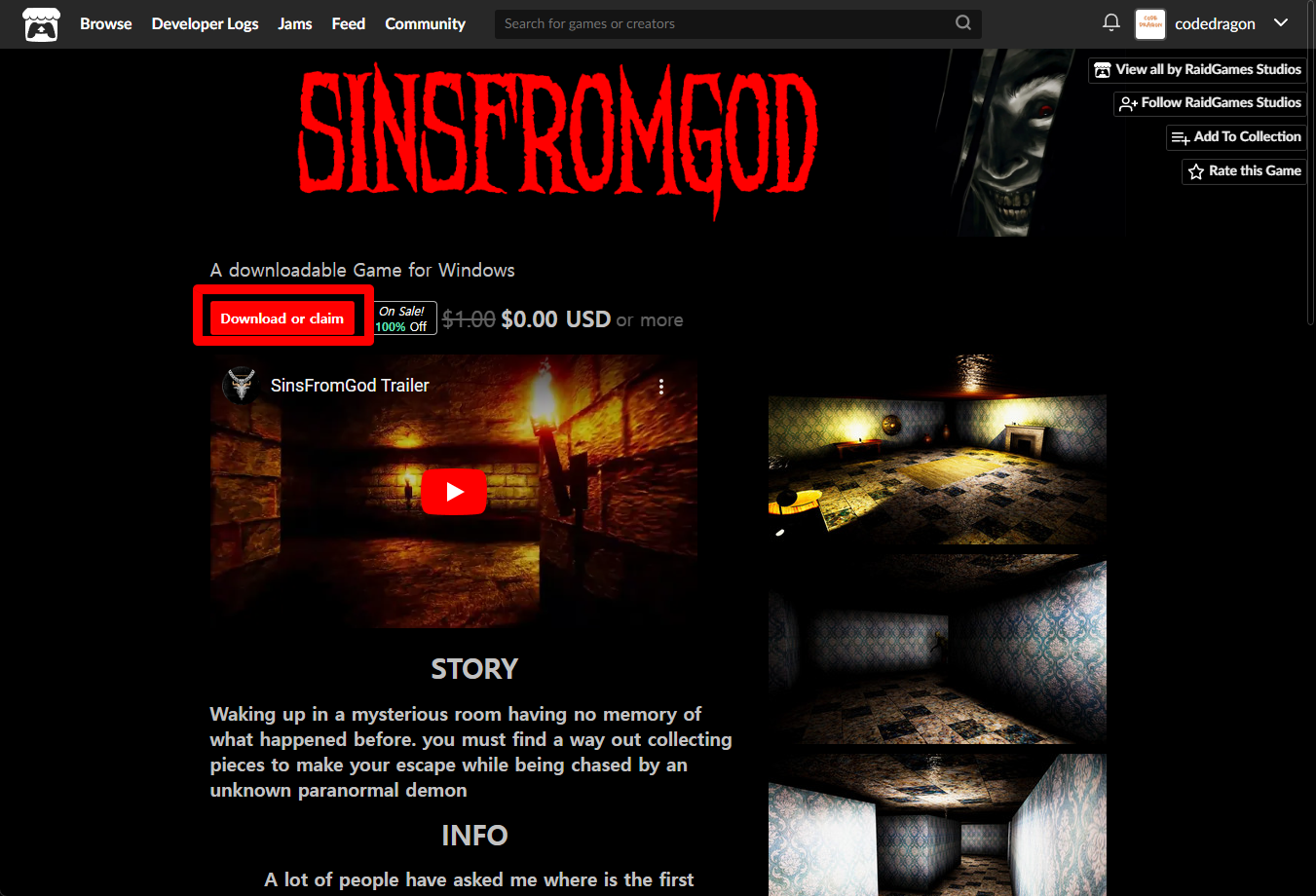 "SinsFromGod" 페이지에 있는 [Download or claim]을 클릭합니다.