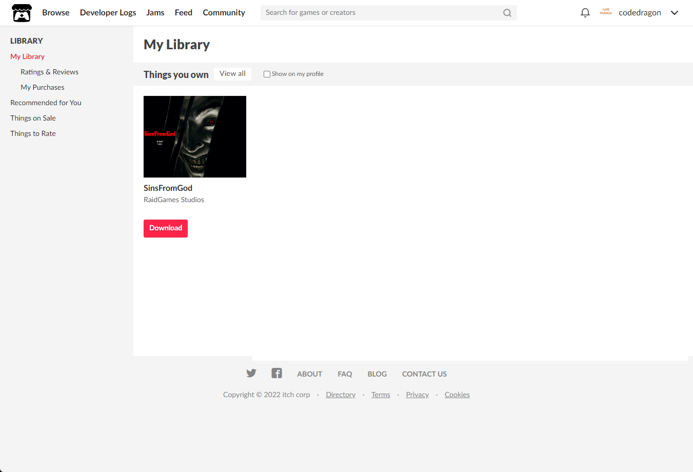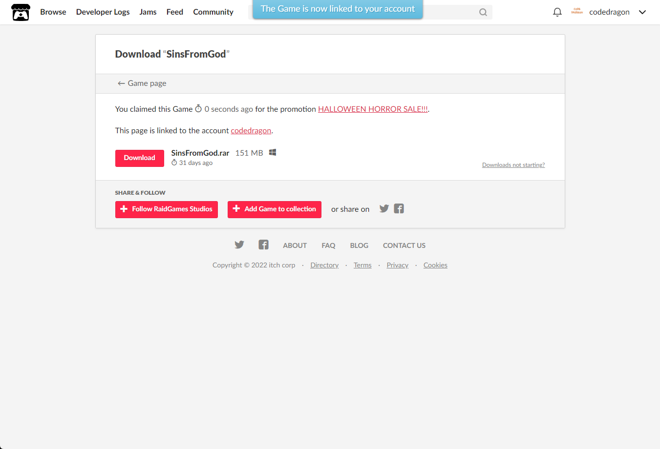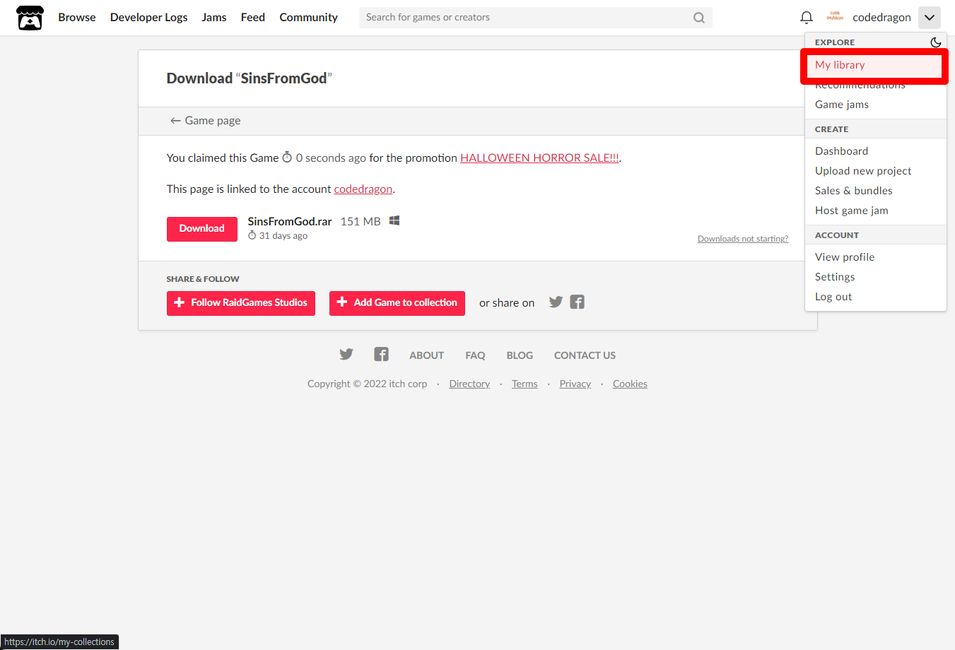 [Claim game]을 클릭하면 "SinsFromGod" 게임이 나의 게임 라이브러리에 추가되고 설치파일을 다운받을 수 있는 페이지로 이동됩니다.