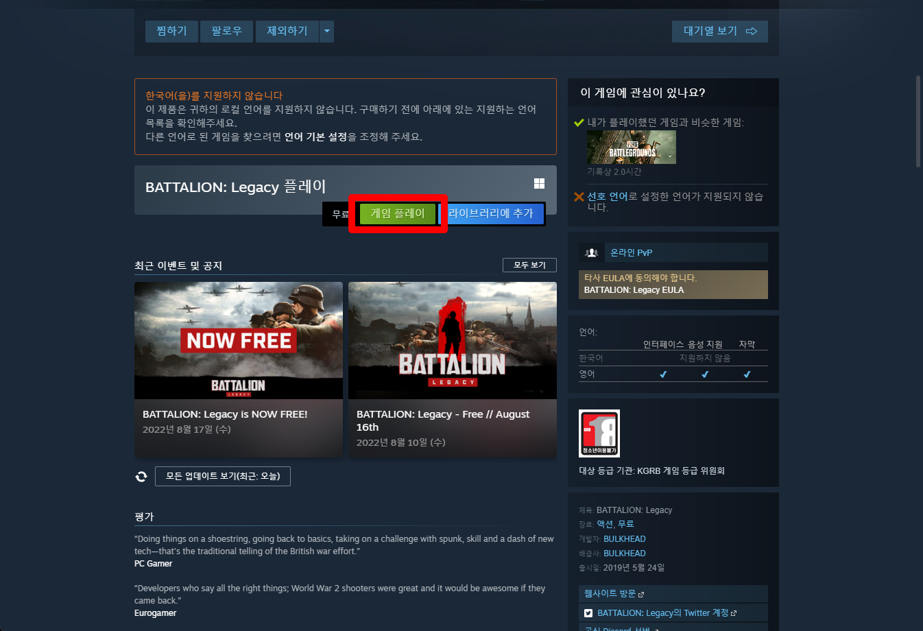 "BATTALION: Legacy" 페이지를 내려 [게임 플레이]를 클릭하면 됩니다.
