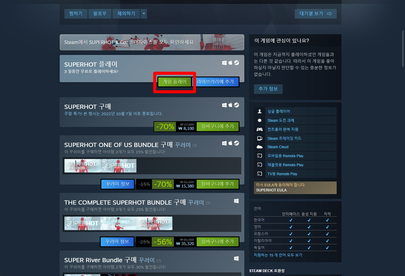 "SUPERHOT" 게임페이지를 조금 내려서 [게임 플레이] 버튼을 클릭하면 됩니다.