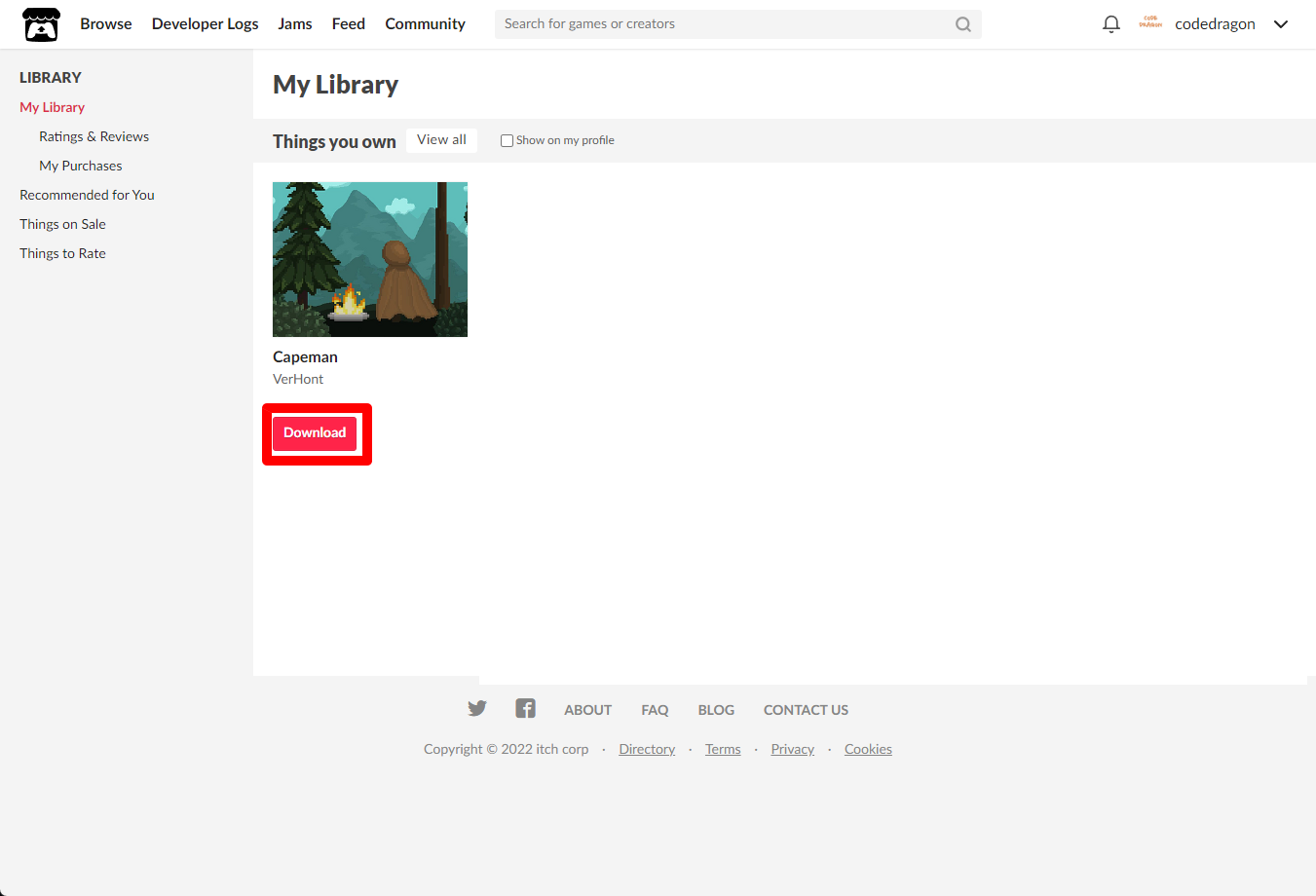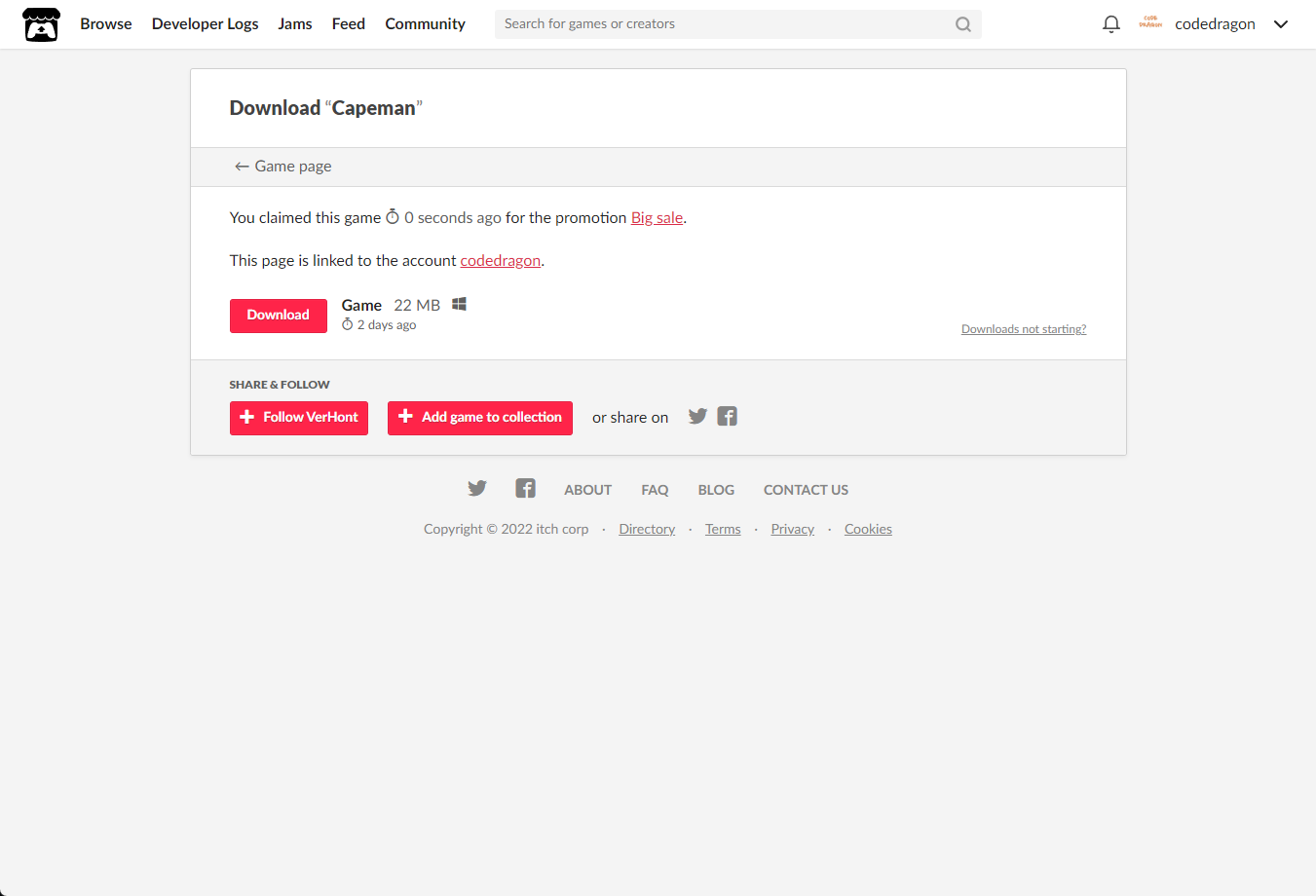 [Claim game]을 클릭하면 "Capeman" 게임이 나의 게임 라이브러리에 추가되고 설치파일을 다운받을 수 있는 페이지로 이동됩니다.