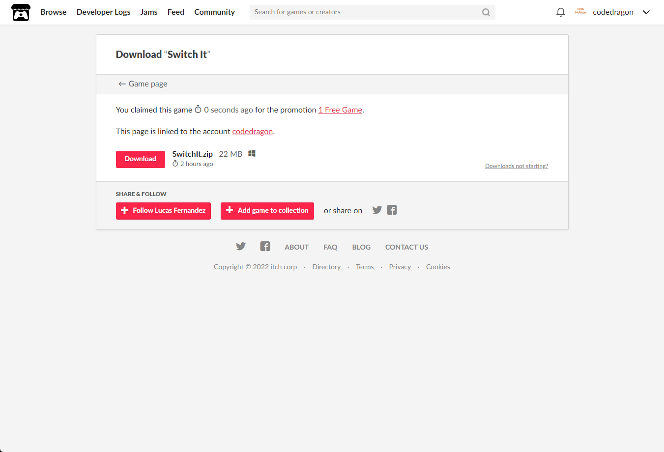[Claim game]을 클릭하면 "Switch It" 게임이 나의 게임 라이브러리에 추가되고 설치파일을 다운받을 수 있는 페이지로 이동됩니다.
