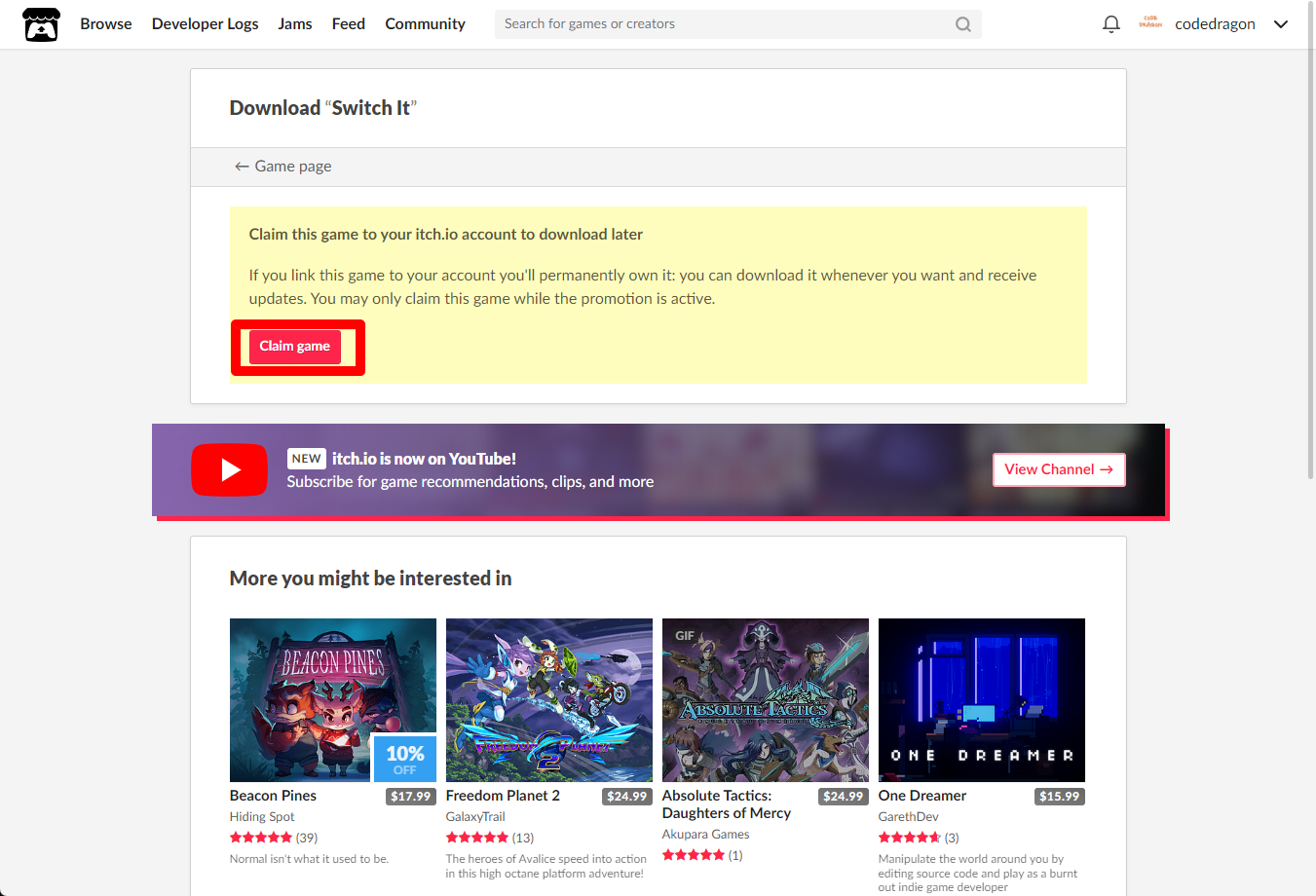 [Claim game]을 클릭하면 "Switch It" 게임이 나의 게임 라이브러리에 추가되고 설치파일을 다운받을 수 있는 페이지로 이동됩니다.