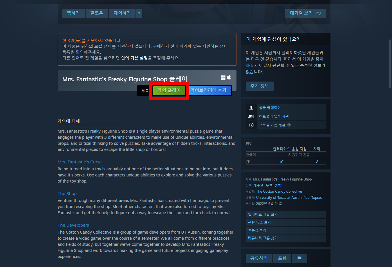 "Mrs. Fantastic's Freaky Figurine Shop" 페이지를 내려 [게임 플레이]를 클릭하면 됩니다.