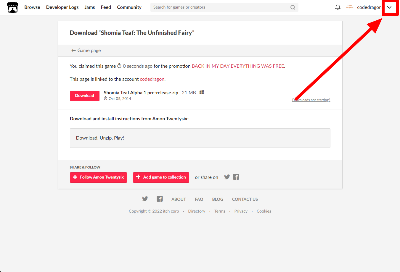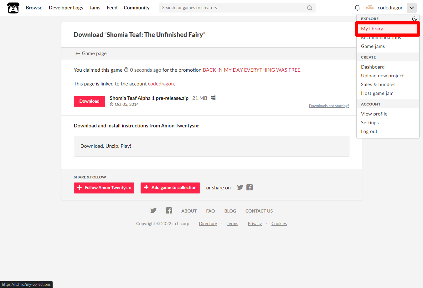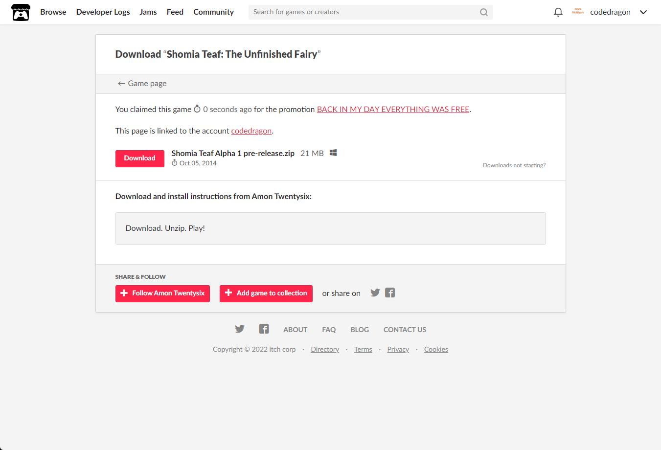 [Claim game]을 클릭하면 "Shomia Teaf: The Unfinished Fairy" 게임이 나의 게임 라이브러리에 추가되고 설치파일을 다운받을 수 있는 페이지로 이동됩니다.