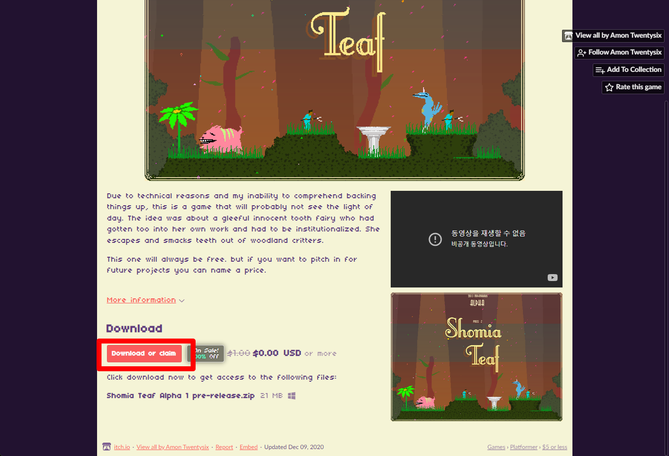 "Shomia Teaf: The Unfinished Fairy" 해당 항목에 있는 [Download] 버튼을 클릭하면 게임의 설치파일을 다운받을 수 있습니다.