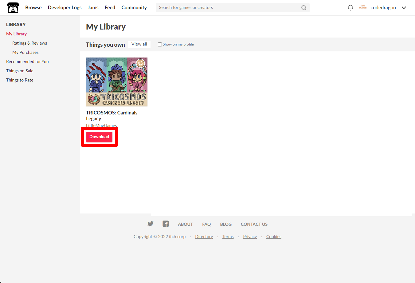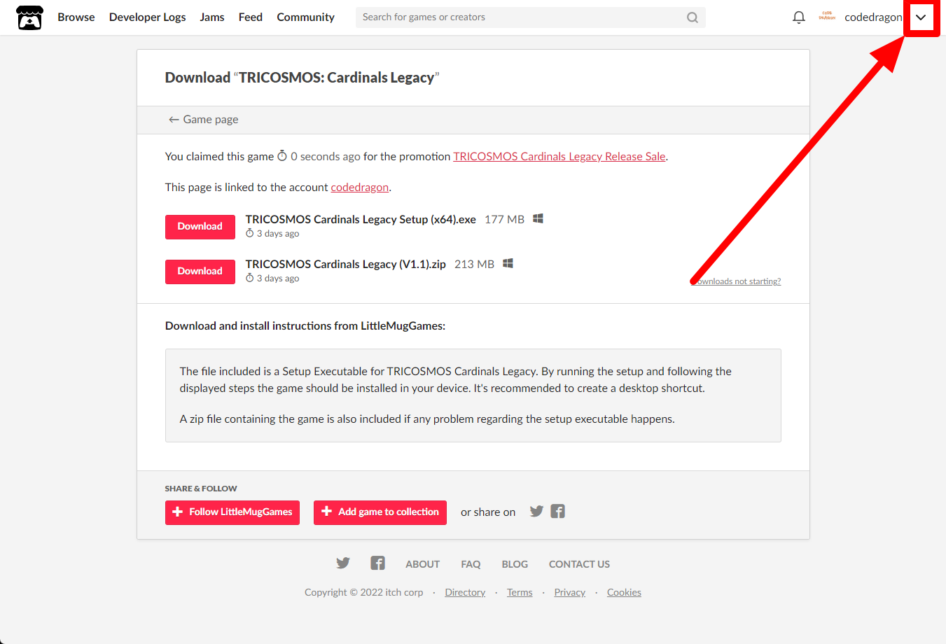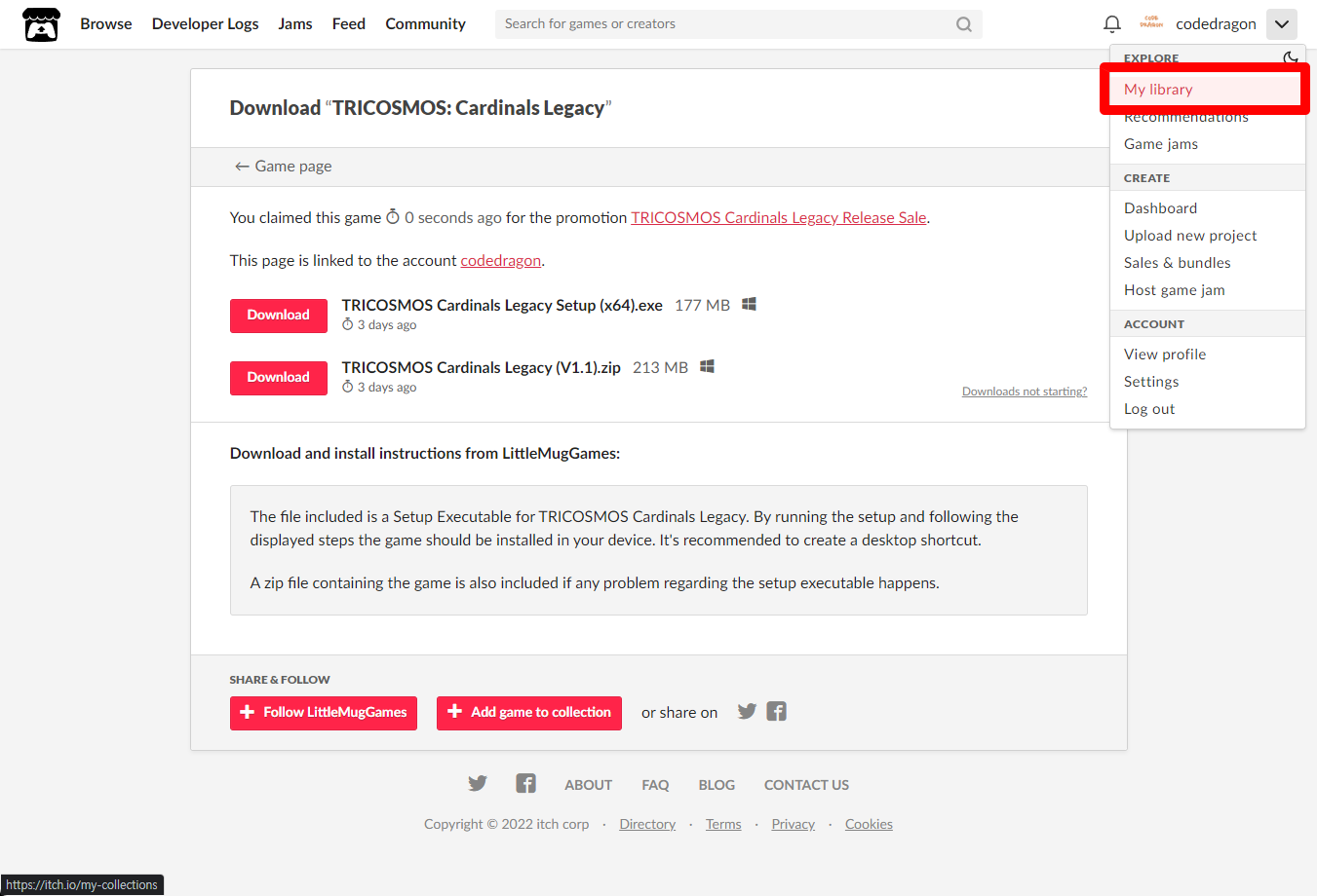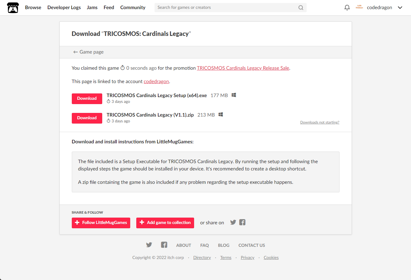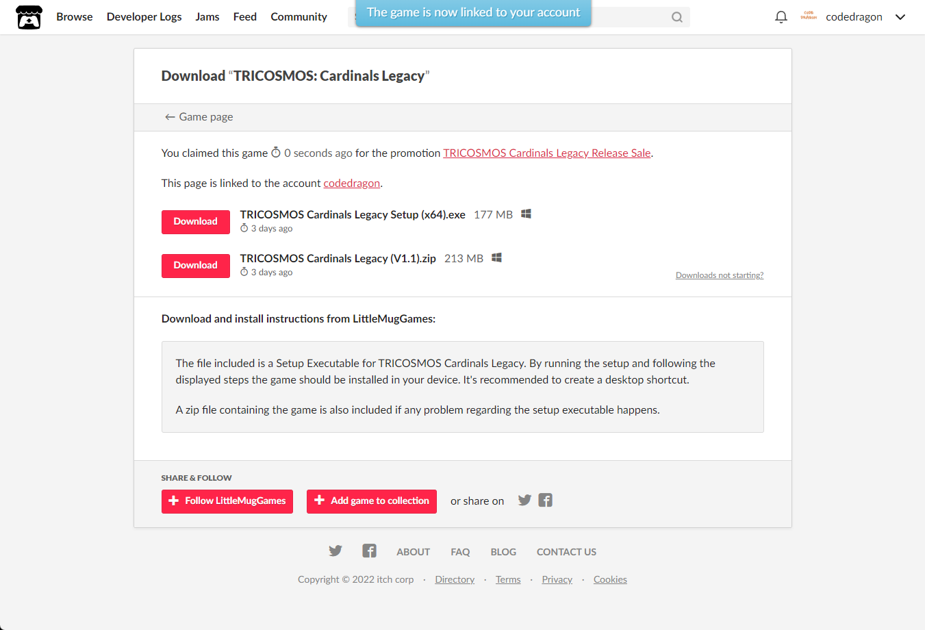 [Claim game]을 클릭하면 "TRICOSMOS: Cardinals Legacy" 게임이 나의 게임 라이브러리에 추가되고 설치파일을 다운받을 수 있는 페이지로 이동됩니다.