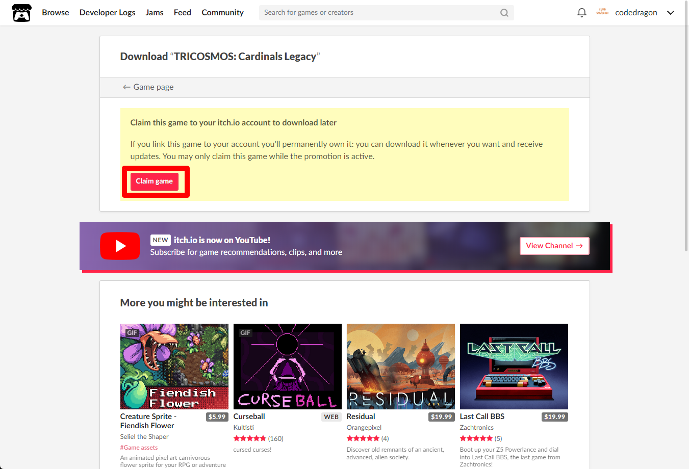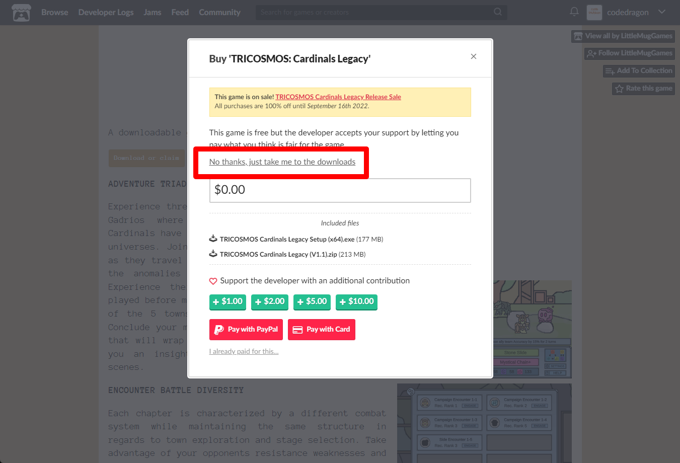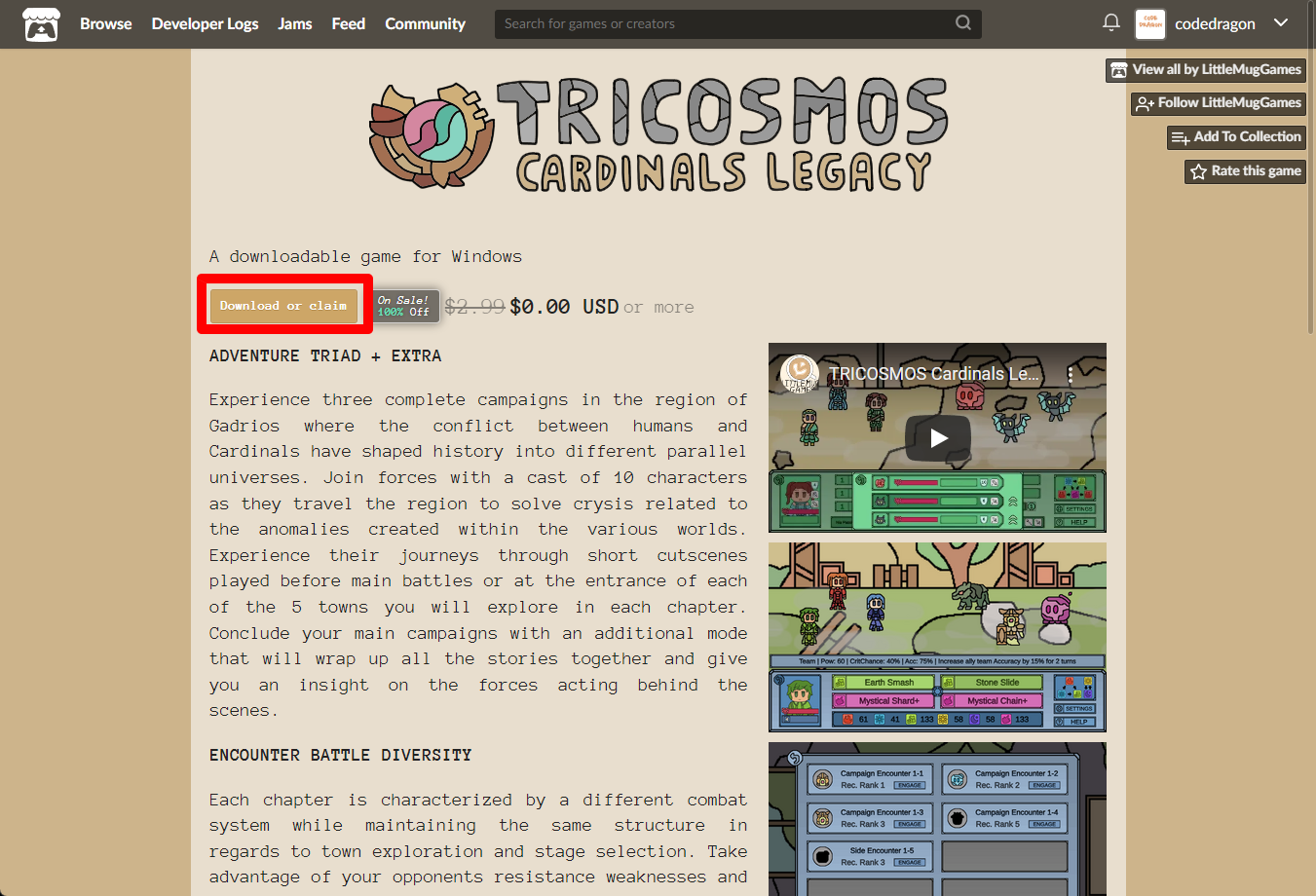 "TRICOSMOS: Cardinals Legacy" 페이지에 있는 [Download or claim]을 클릭합니다.