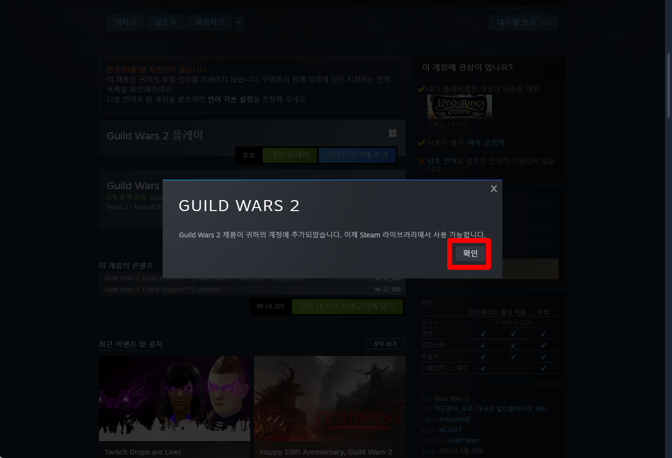 [확인]을 클릭하면 "Guild Wars 2"가 나의 계정의 라이브러리에 추가됩니다.