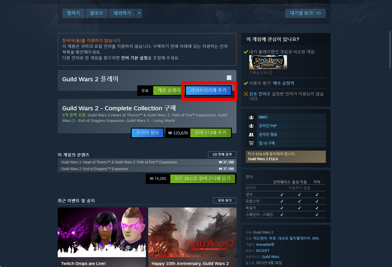 "Guild Wars 2" 페이지를 내려 [라이브러리에 추가]를 클릭합니다.