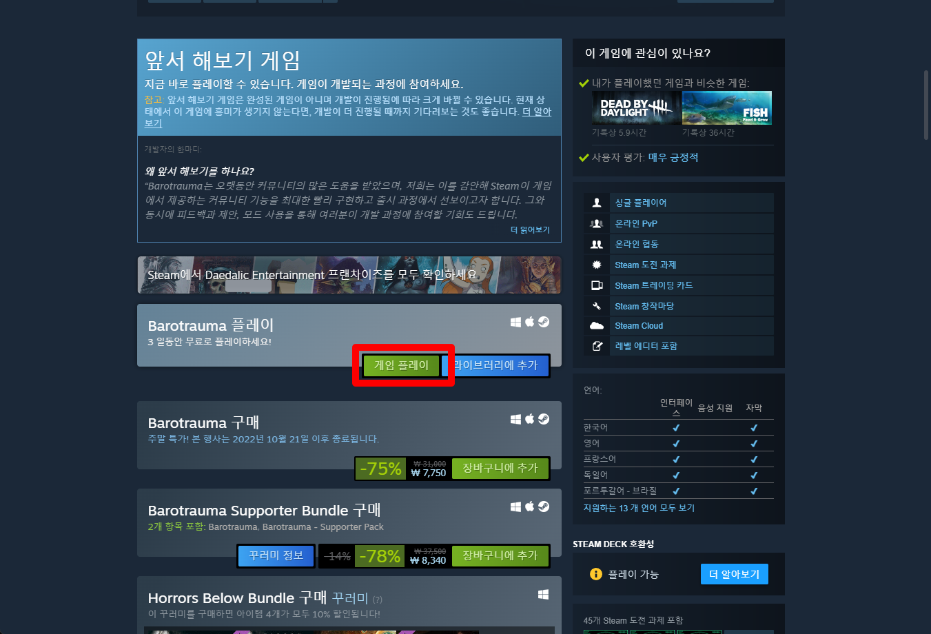 "Barotrauma" 게임페이지를 조금 내려서 [게임 플레이] 버튼을 클릭하면 됩니다.
