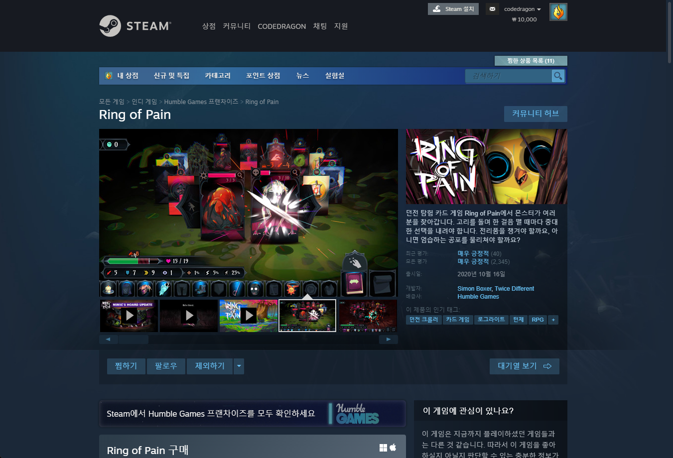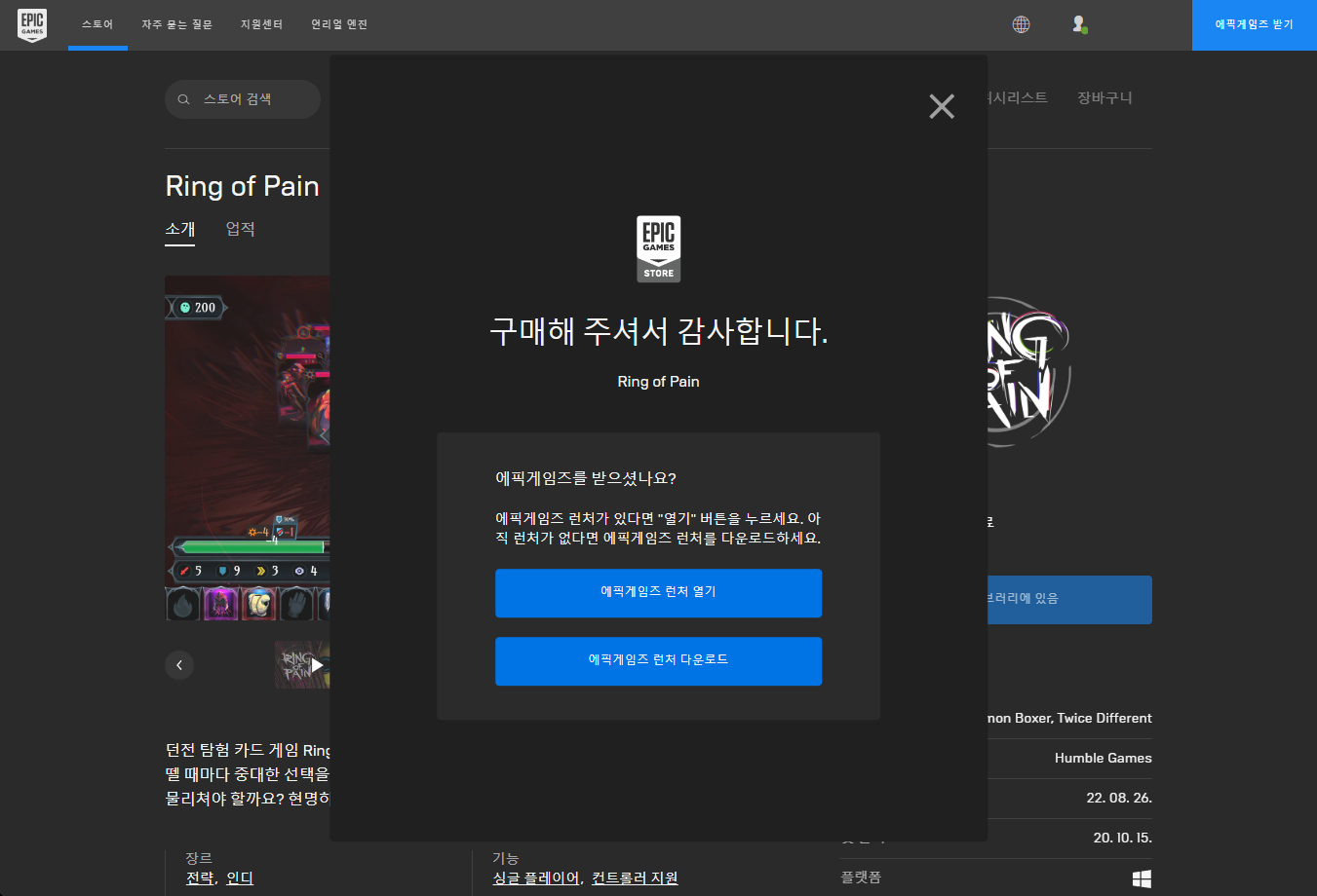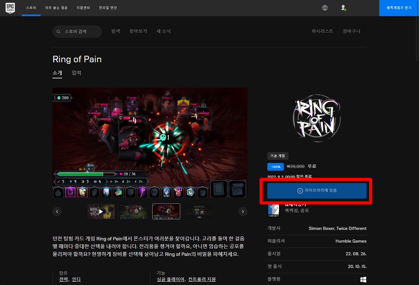 "Ring of Pain" 게임페이지의 "받기"버튼이 "라이브러리에 있음"으로 변경이 되어져서 해당 게임을 보유하고 있는 것 확인할 수 있습니다.