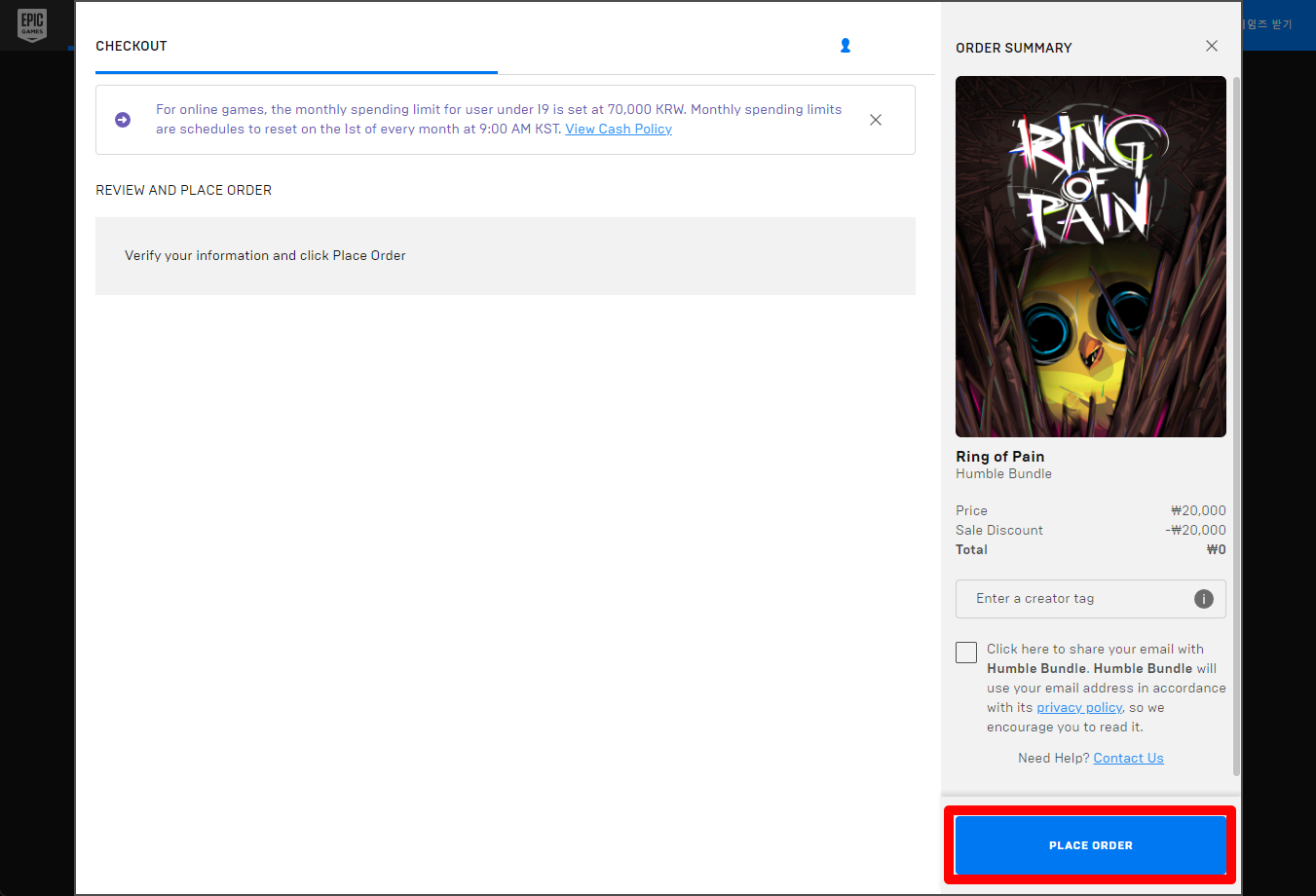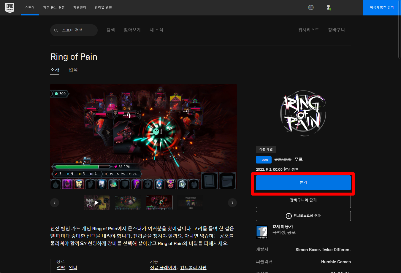 "Ring of Pain" 게임 정보 페이지에서 [받기] 버튼을 클릭해 무료로 구매하도록 하겠습니다.