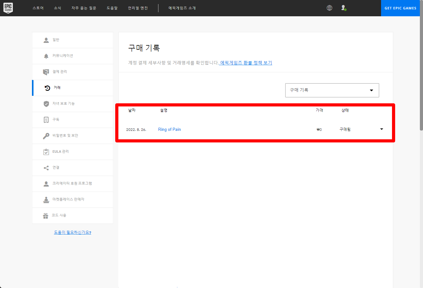 마이페이지에서 왼쪽의 [거래] 메뉴를 클릭하면 구매한 "Ring of Pain" 게임 목록을 확인할 수 있습니다.