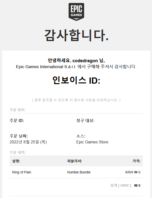 - "Ring of Pain" 구매내역 확인하기 - 이메일 주문내역