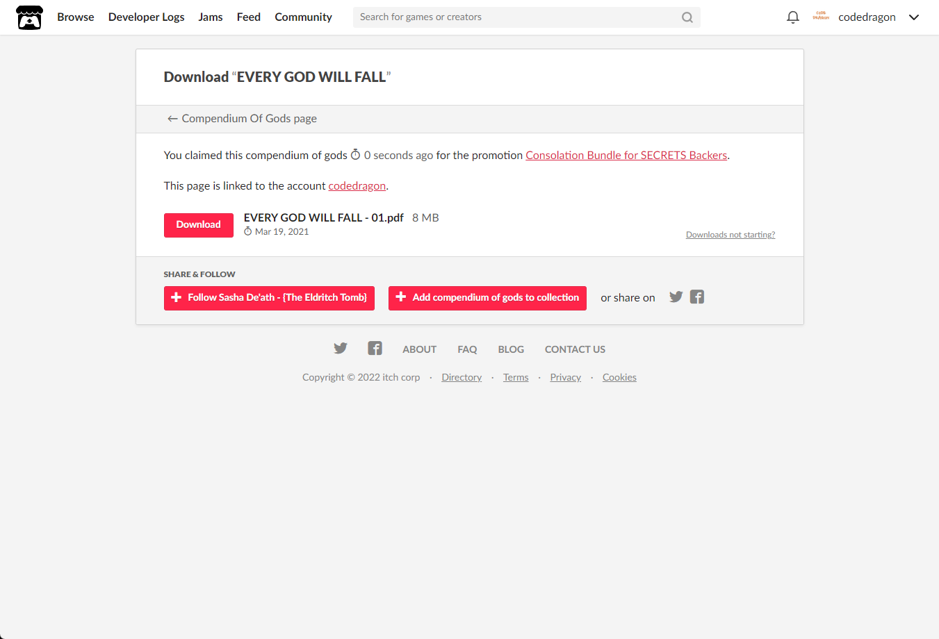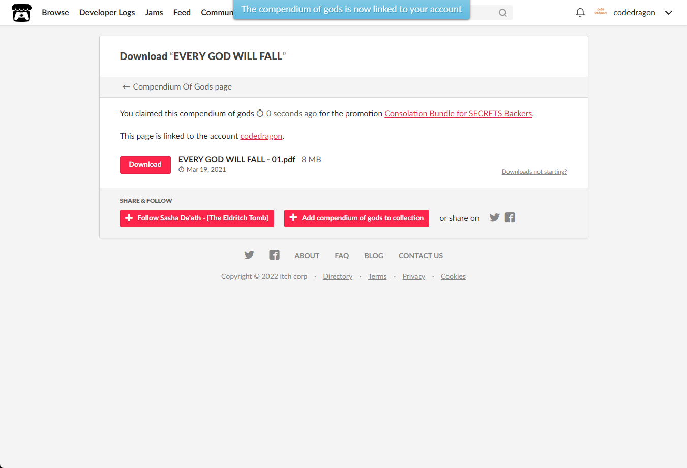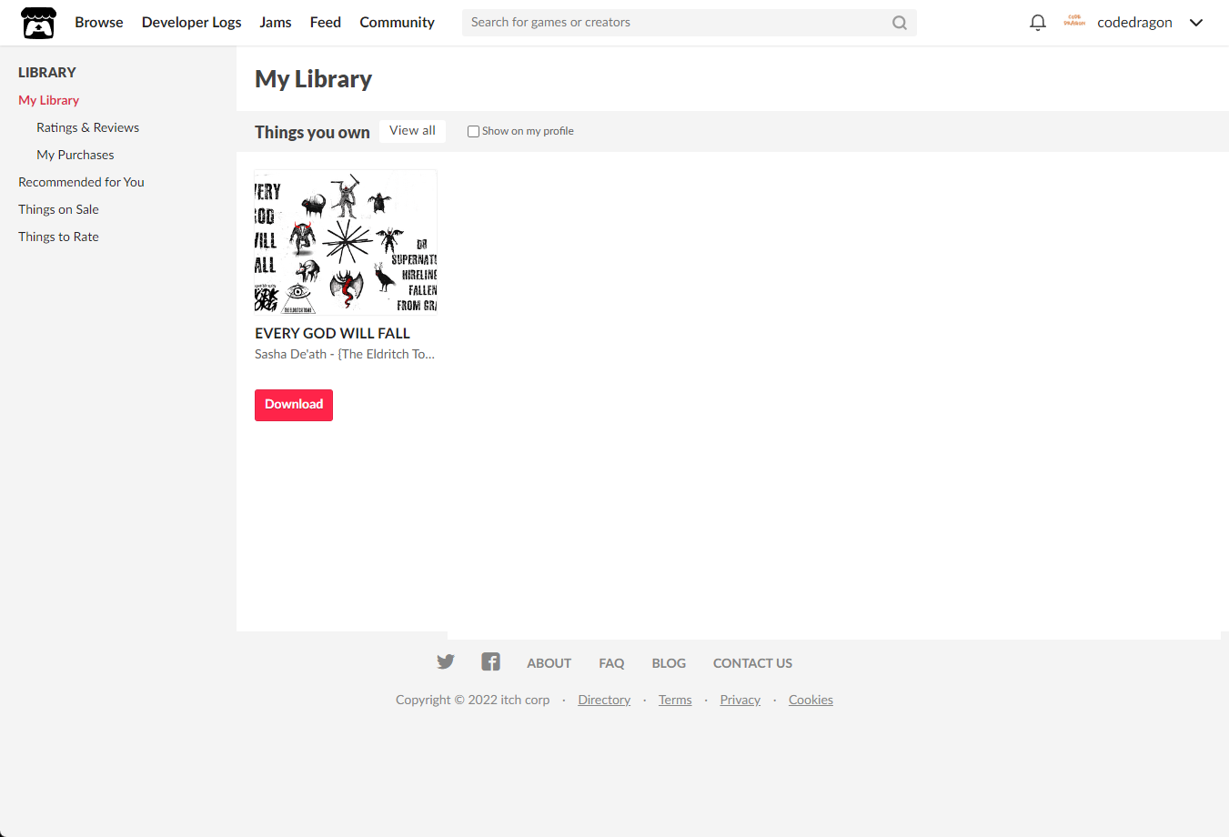 [Claim compendium of gods]을 클릭하면 "EVERY GOD WILL FALL" 게임이 나의 게임 라이브러리에 추가되고 설치파일을 다운받을 수 있는 페이지로 이동됩니다.