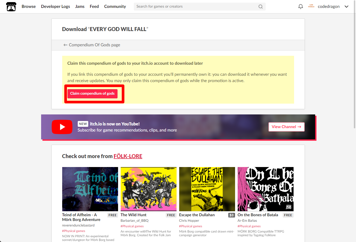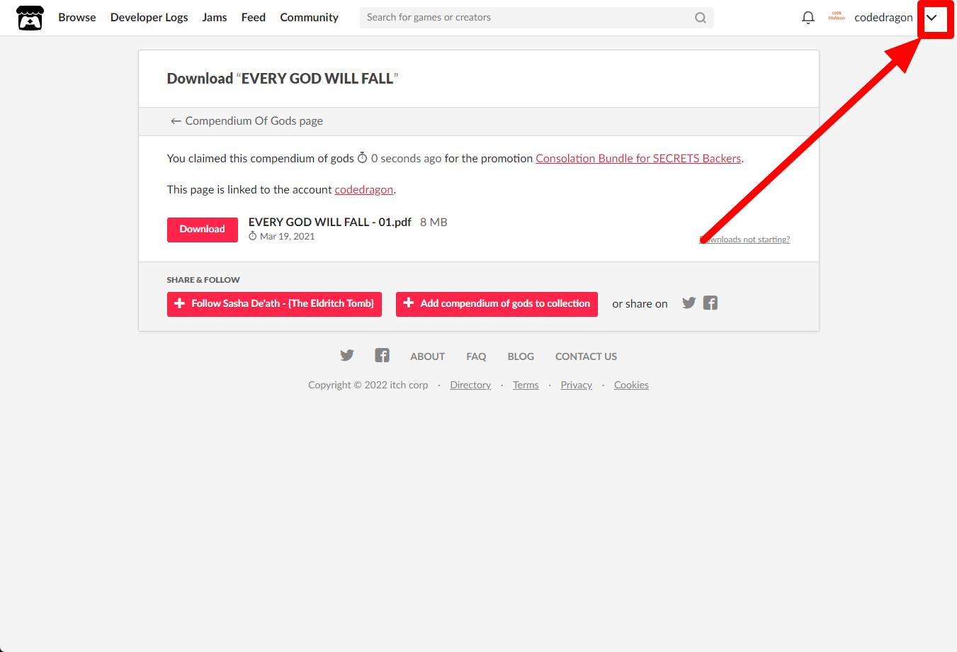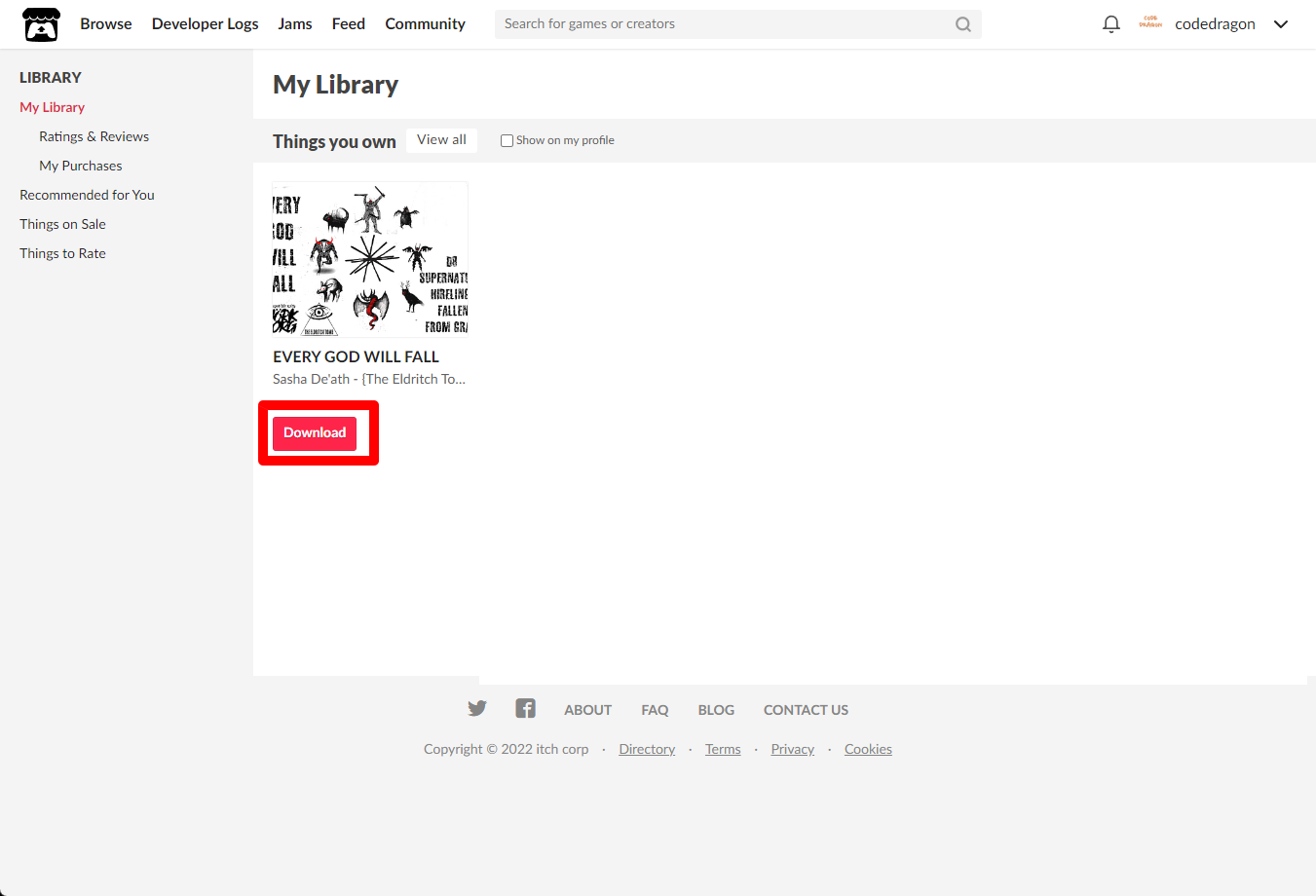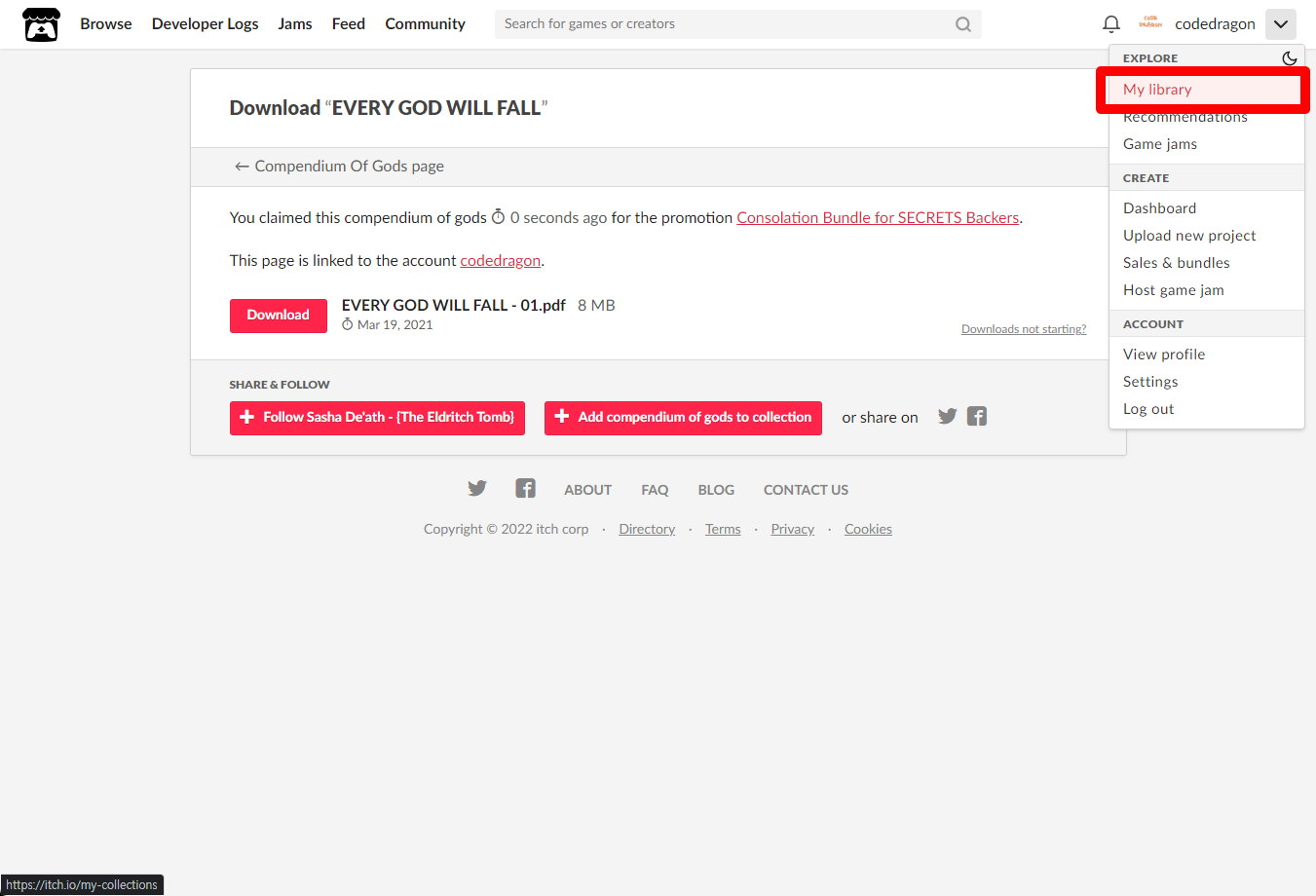 [Claim compendium of gods]을 클릭하면 "EVERY GOD WILL FALL" 게임이 나의 게임 라이브러리에 추가되고 설치파일을 다운받을 수 있는 페이지로 이동됩니다.