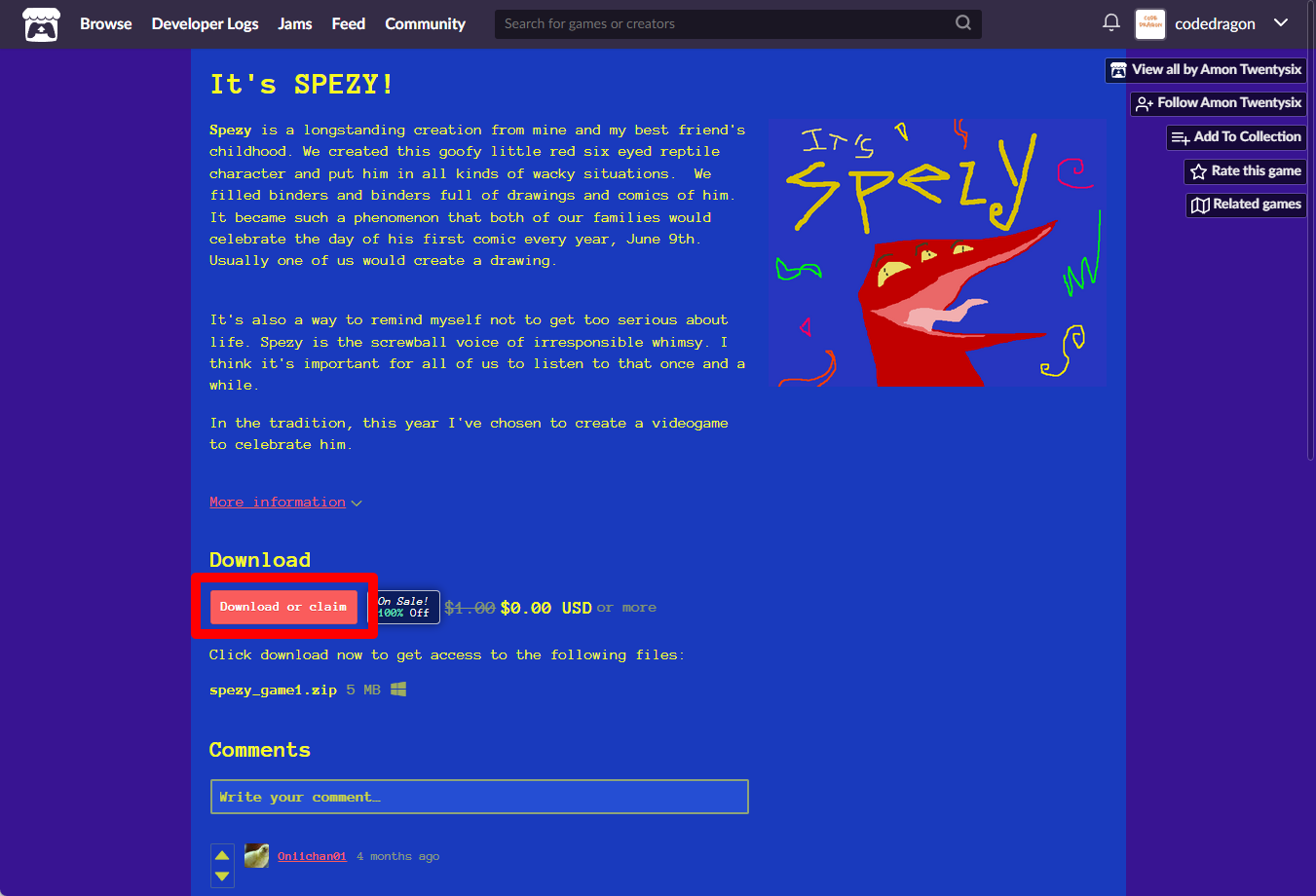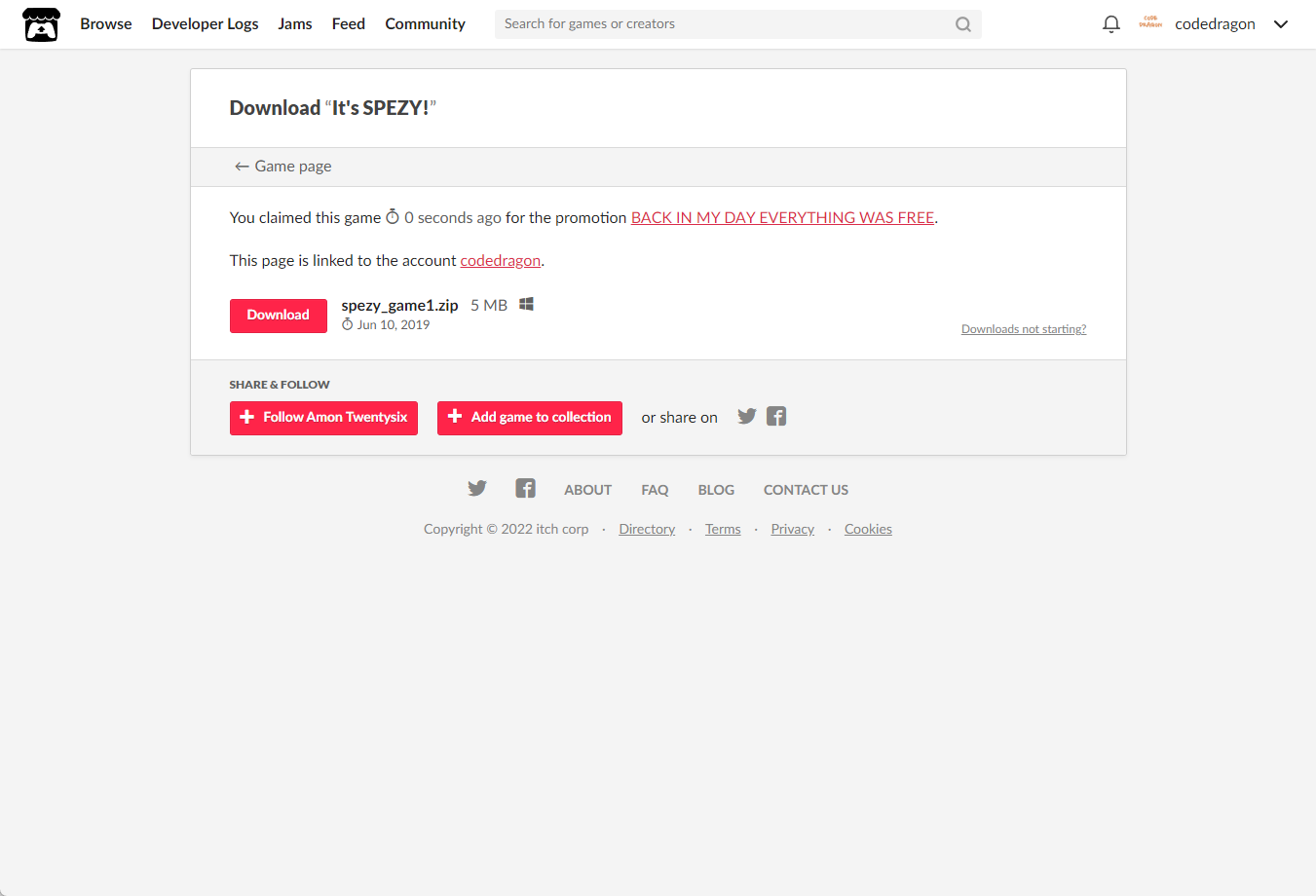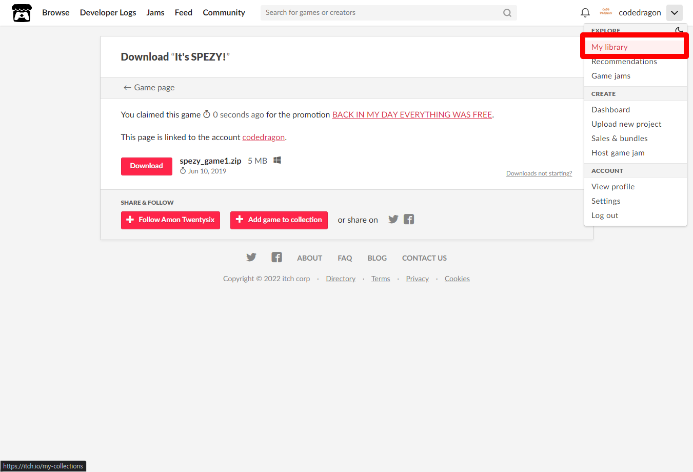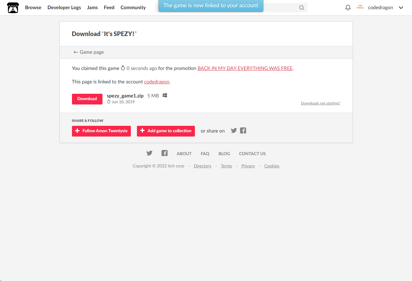 [Claim game]을 클릭하면 "It's SPEZY!" 게임이 나의 게임 라이브러리에 추가되고 설치파일을 다운받을 수 있는 페이지로 이동됩니다.