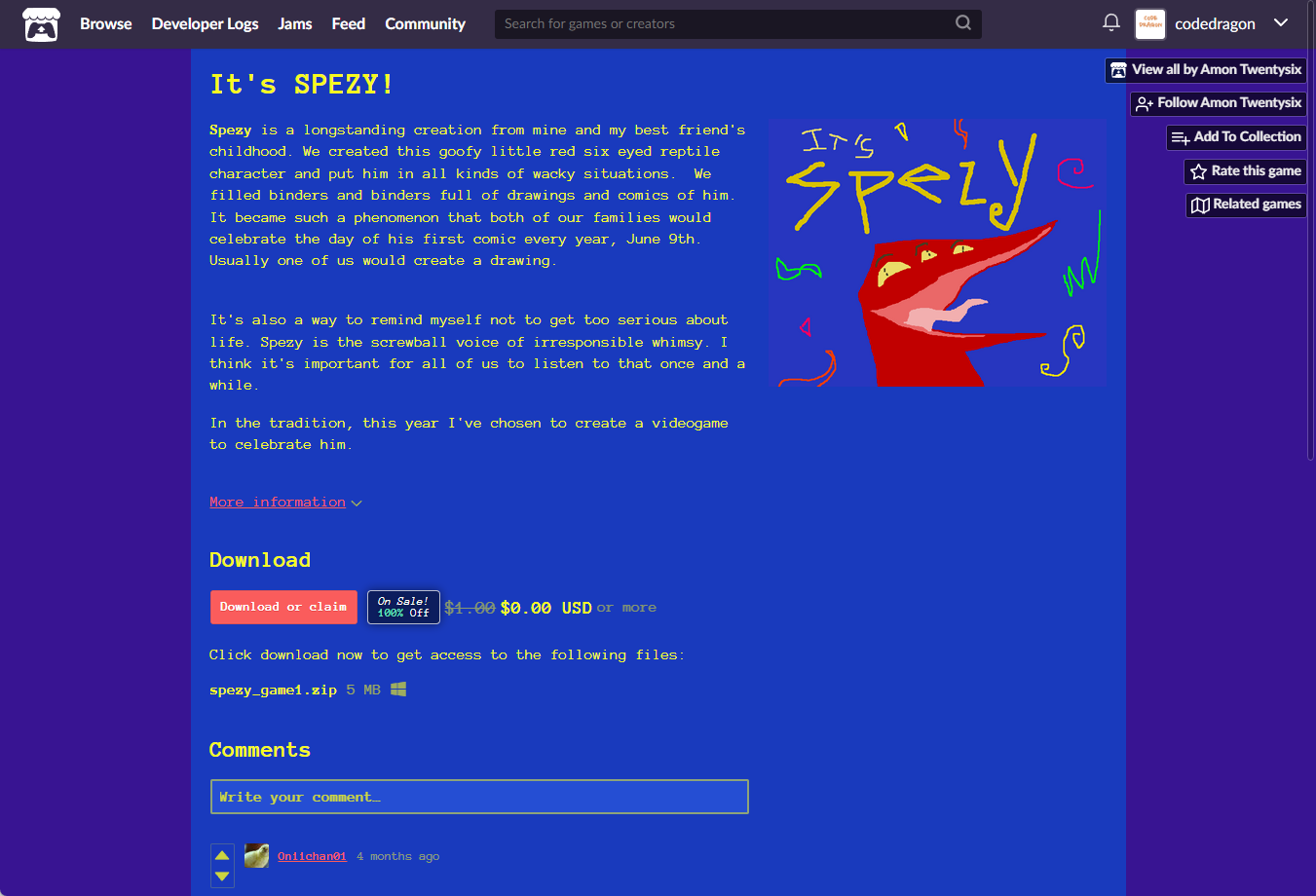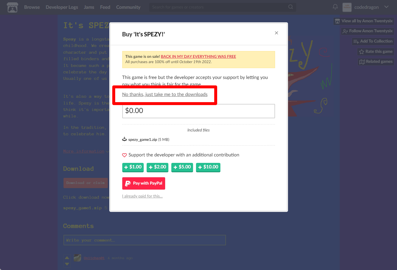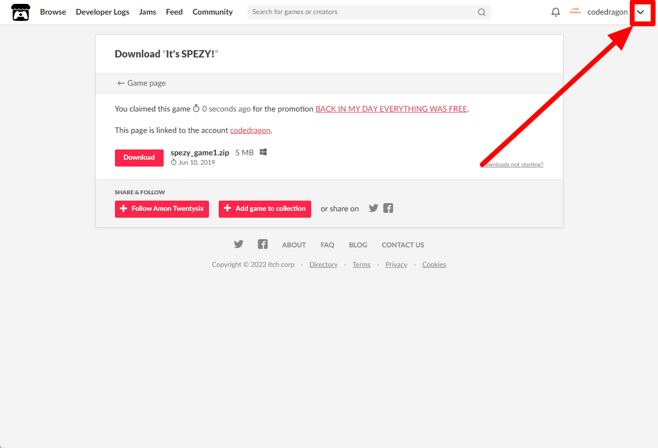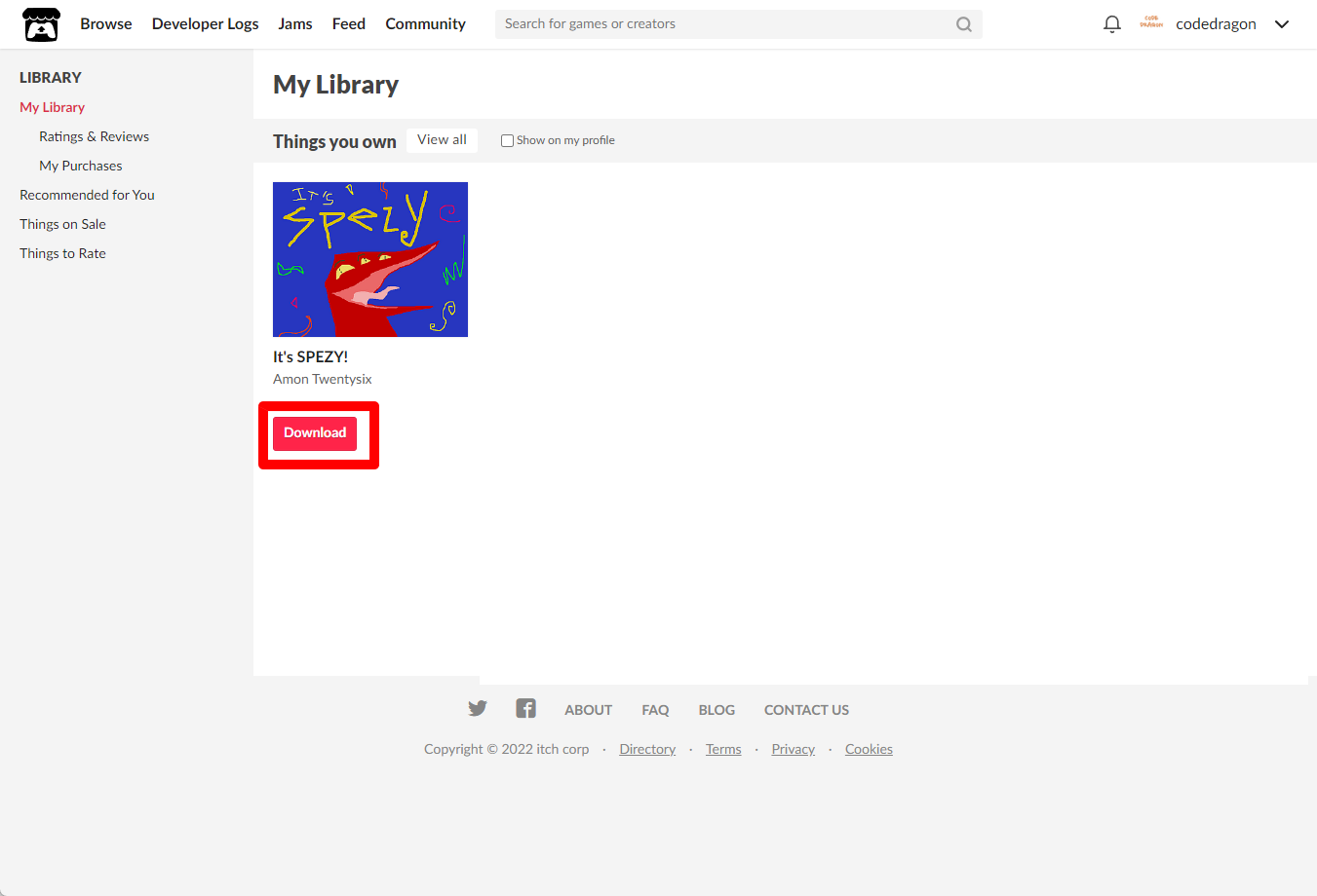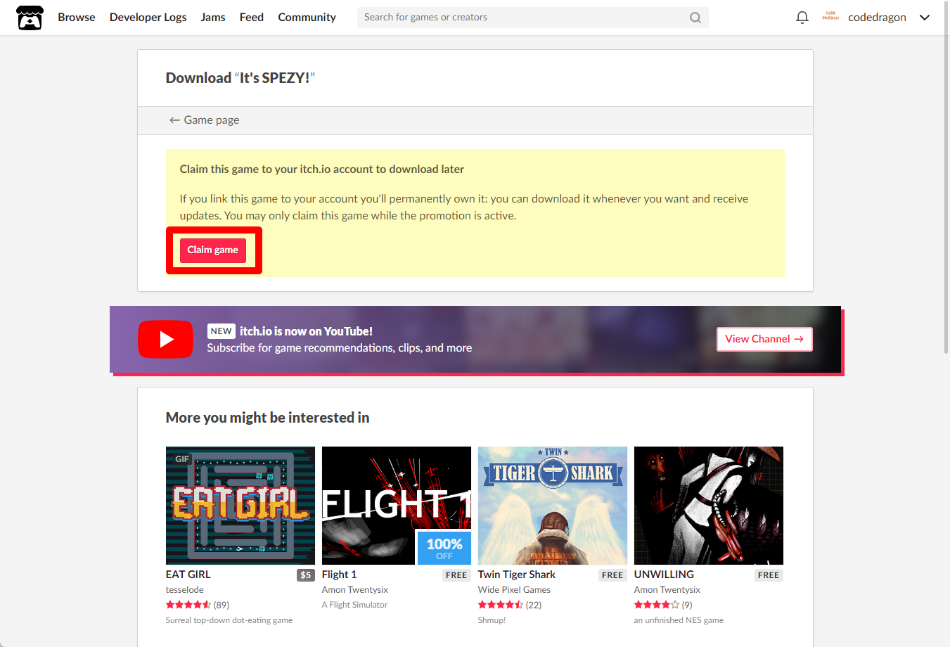 [Claim game]을 클릭하면 "It's SPEZY!" 게임이 나의 게임 라이브러리에 추가되고 설치파일을 다운받을 수 있는 페이지로 이동됩니다.