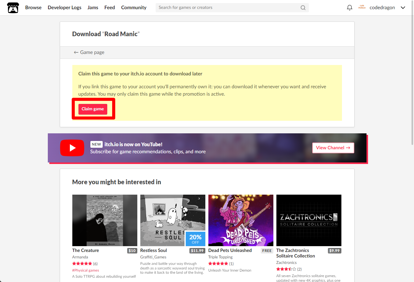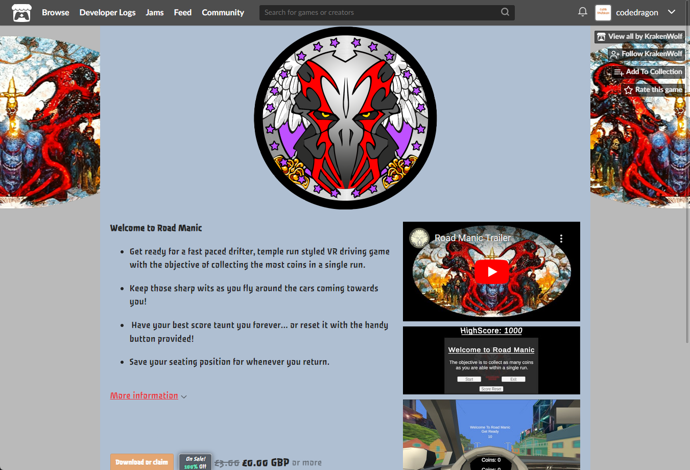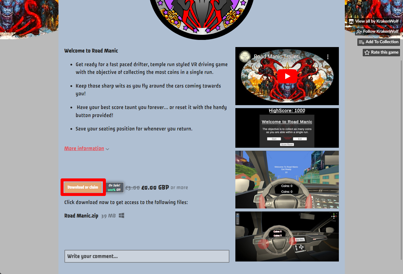 "Road Manic" 페이지에 있는 [Download or claim] 클릭합니다.
