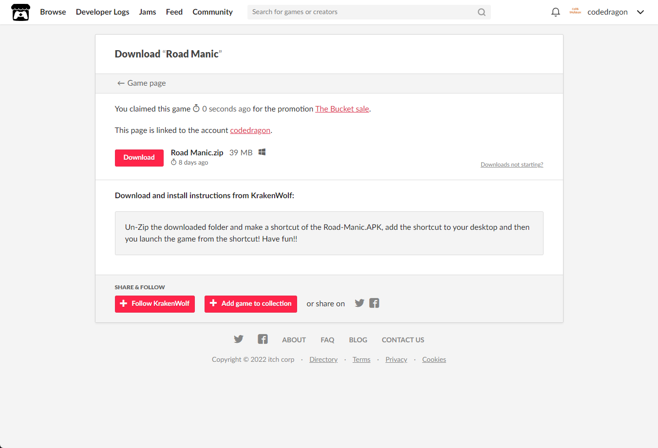 [Claim game] 클릭하면 "Road Manic" 게임이 나의 게임 라이브러리에 추가되고 설치파일을 다운받을 있는 페이지로 이동됩니다.