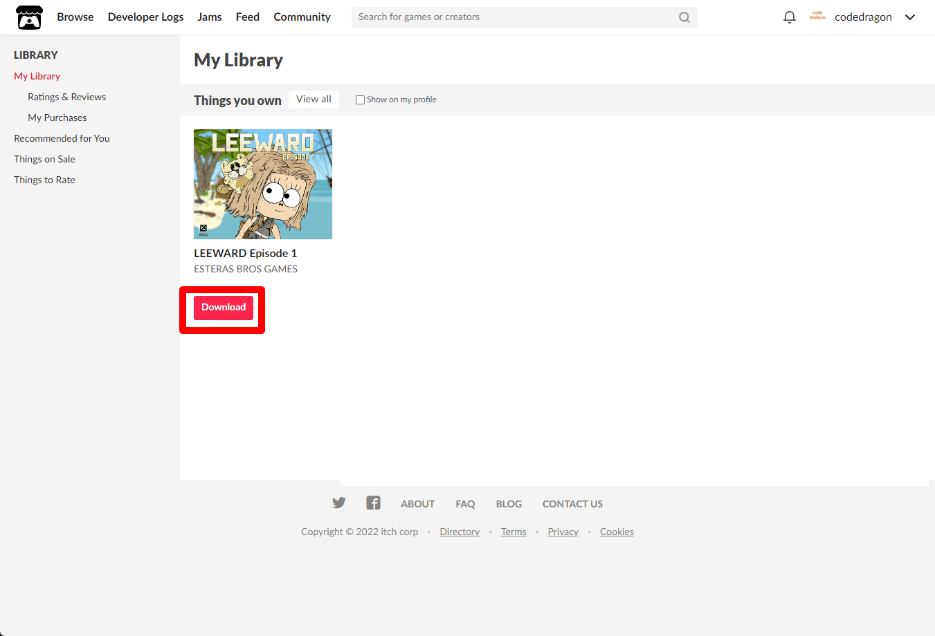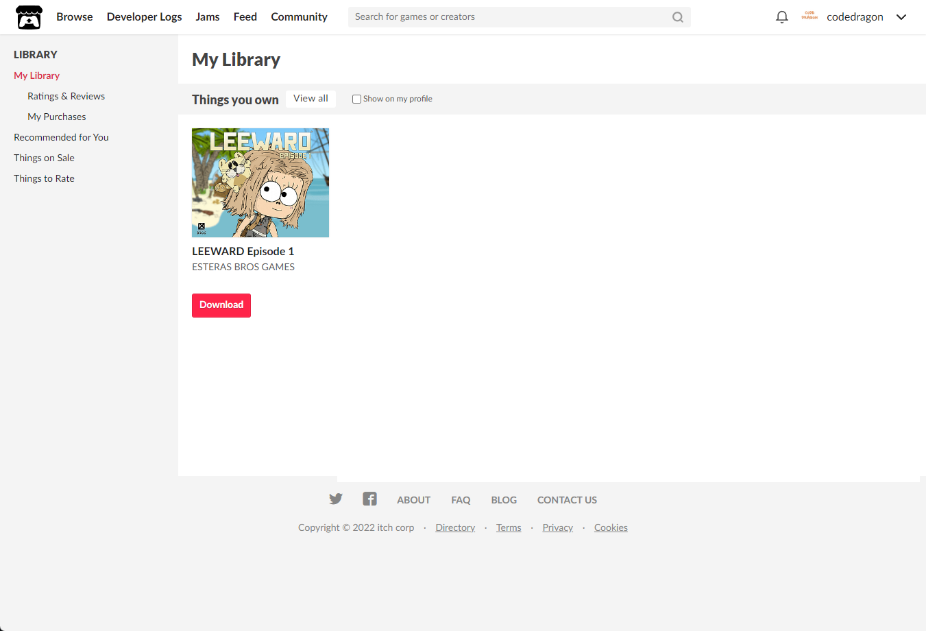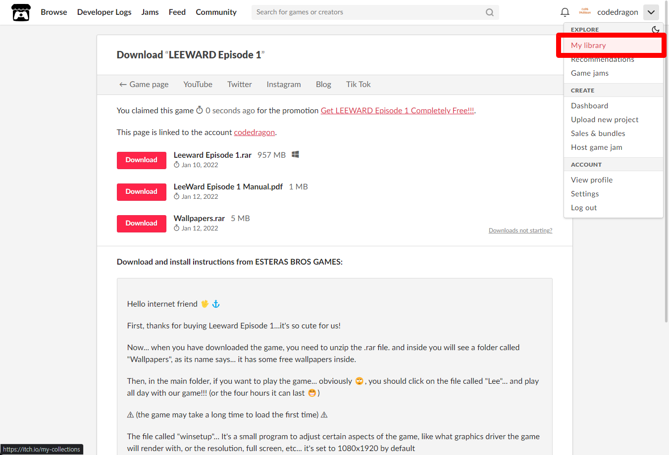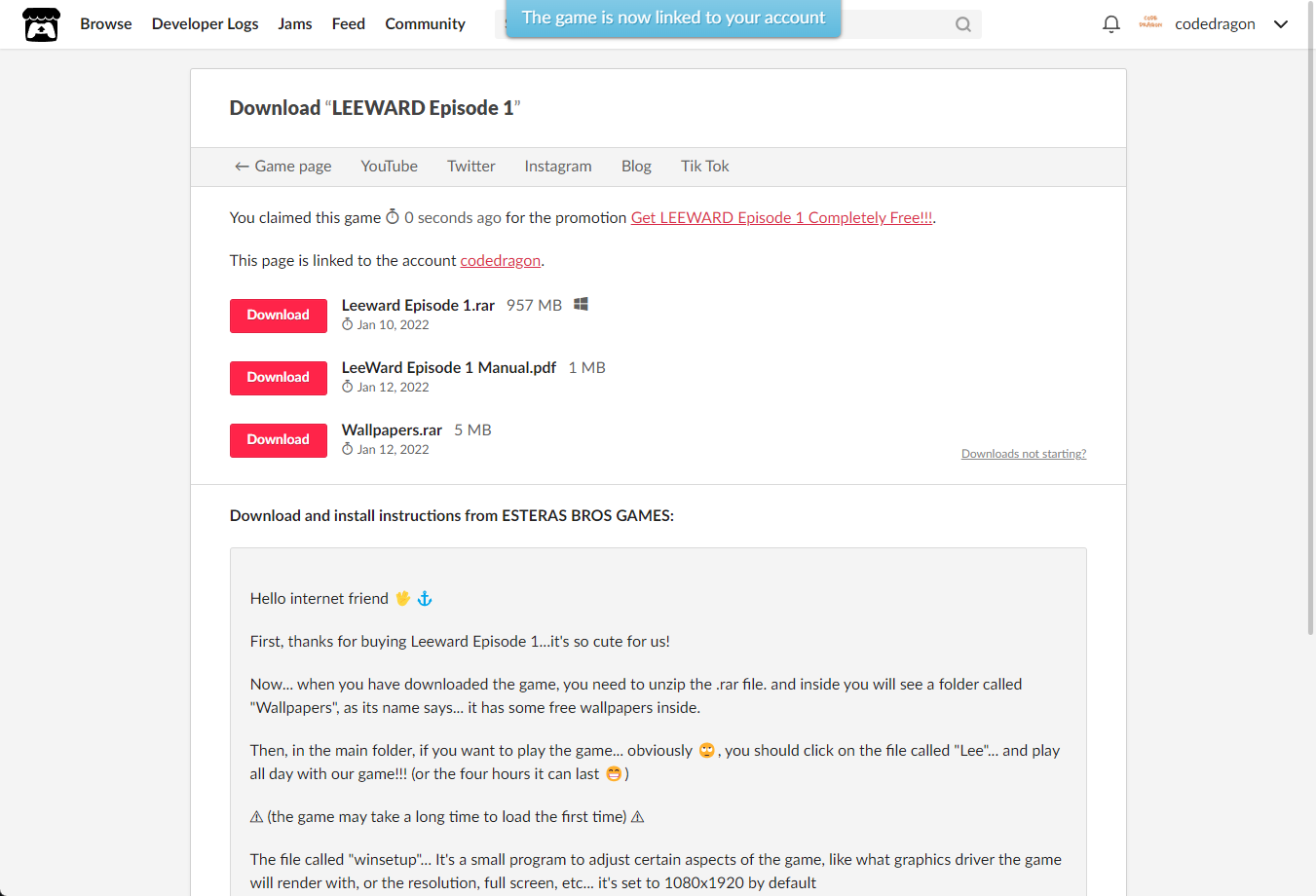 [Claim game]을 클릭하면 "LEEWARD Episode 1" 게임이 나의 게임 라이브러리에 추가되고 설치파일을 다운받을 수 있는 페이지로 이동됩니다.