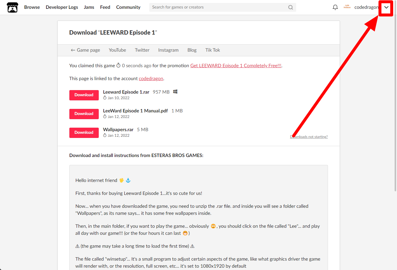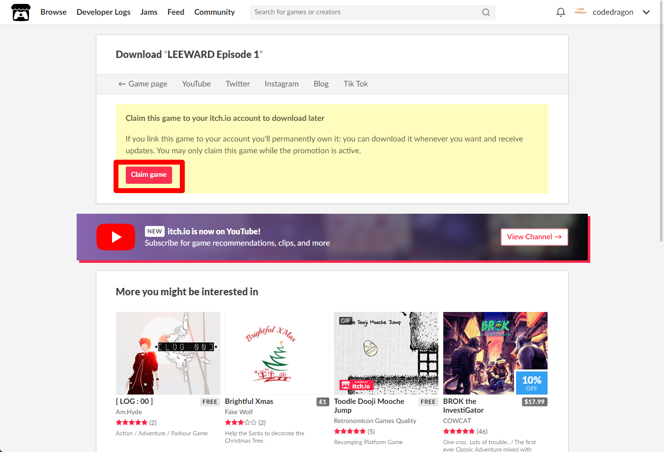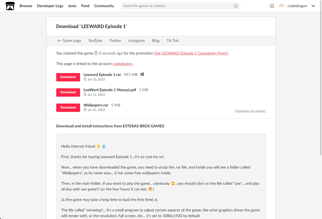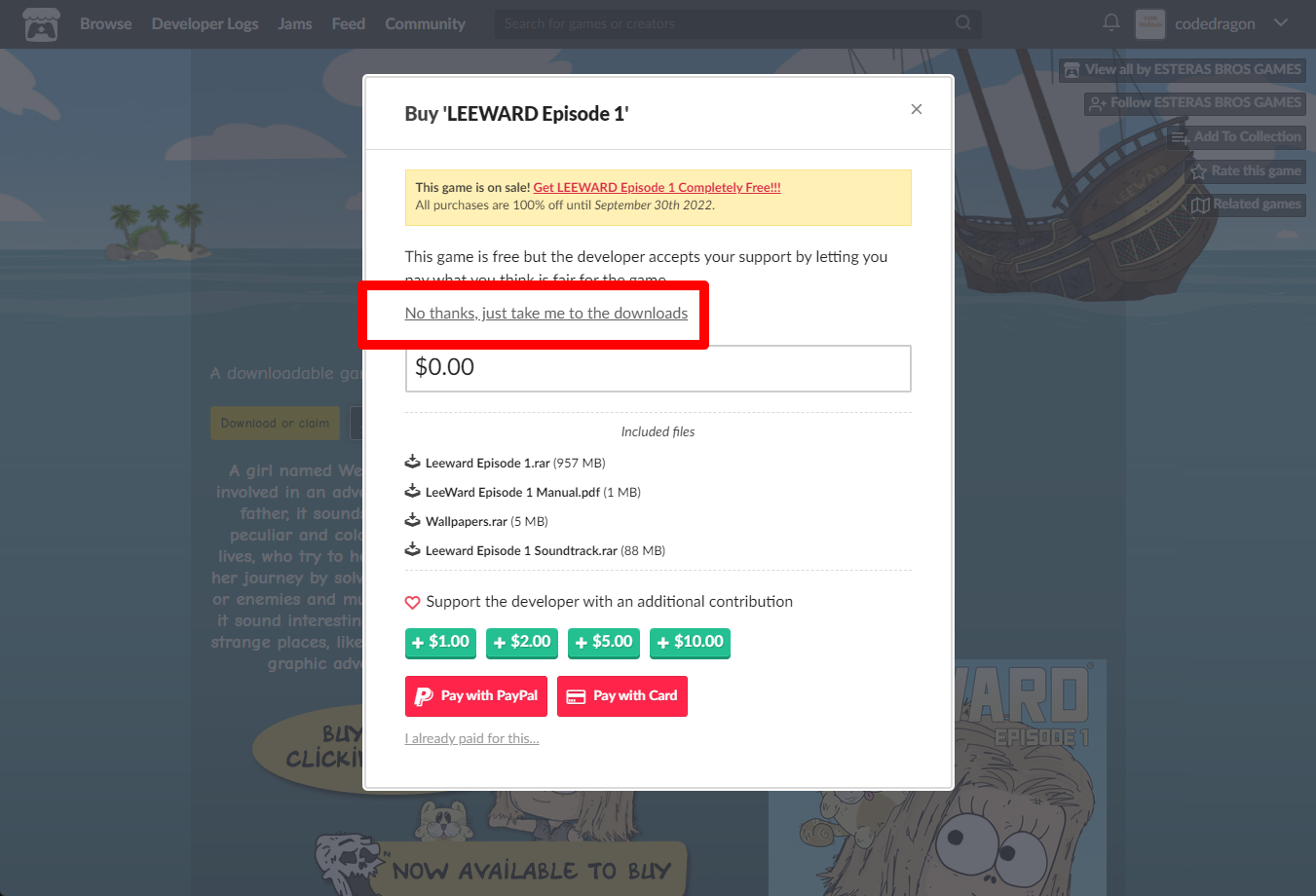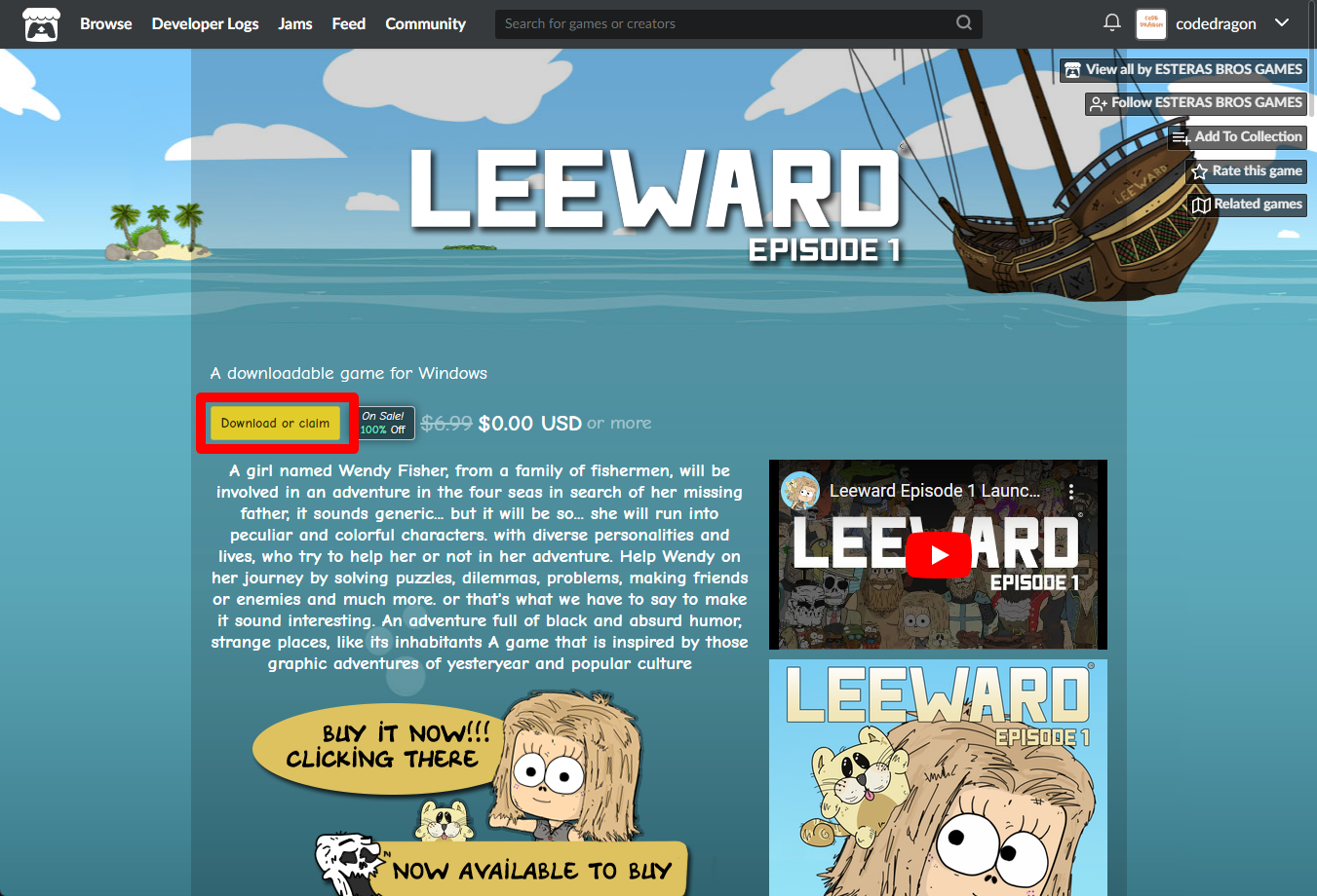 "LEEWARD Episode 1" 페이지에 있는 [Download or claim]을 클릭합니다.