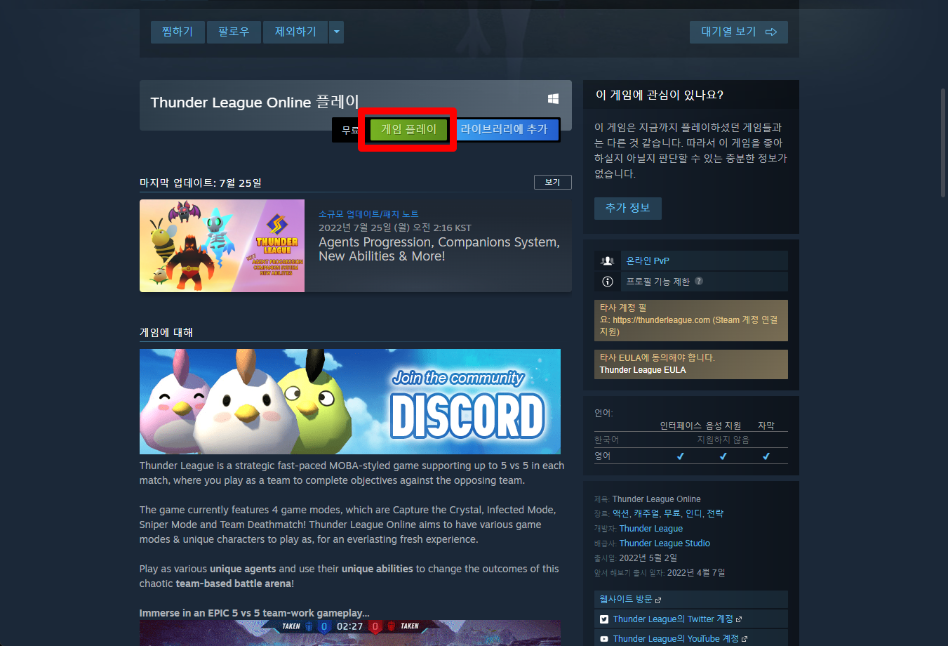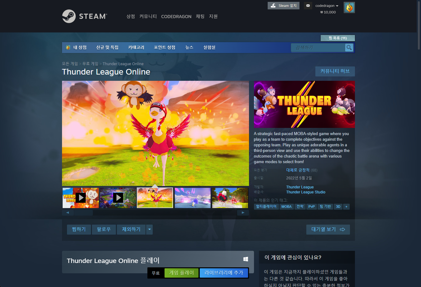 "Thunder League Online" 스팀 페이지 입니다.