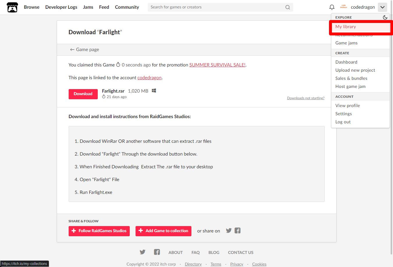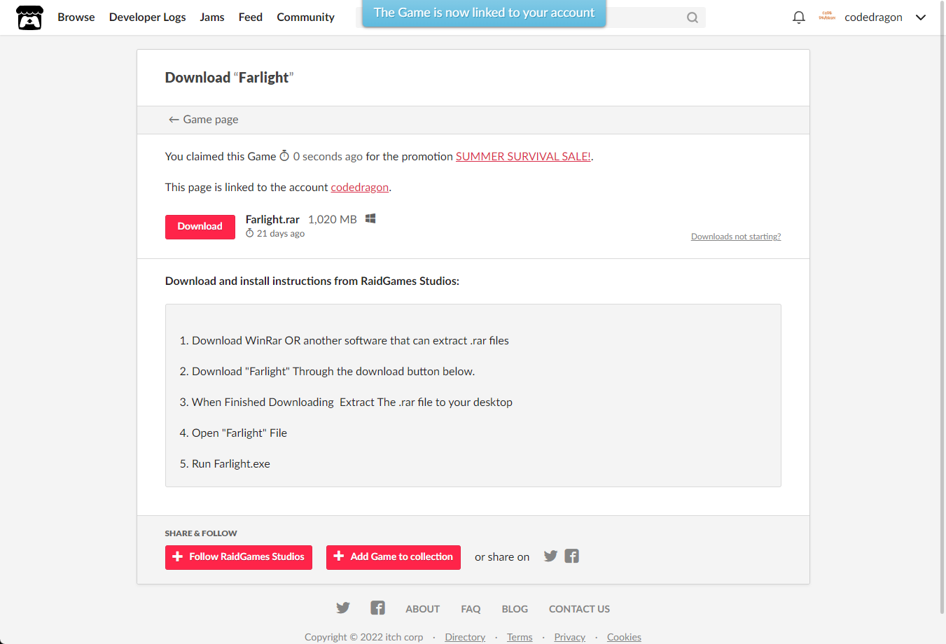 [Claim game]을 클릭하면 "Farlight" 게임이 나의 게임 라이브러리에 추가되고 설치파일을 다운받을 수 있는 페이지로 이동됩니다.