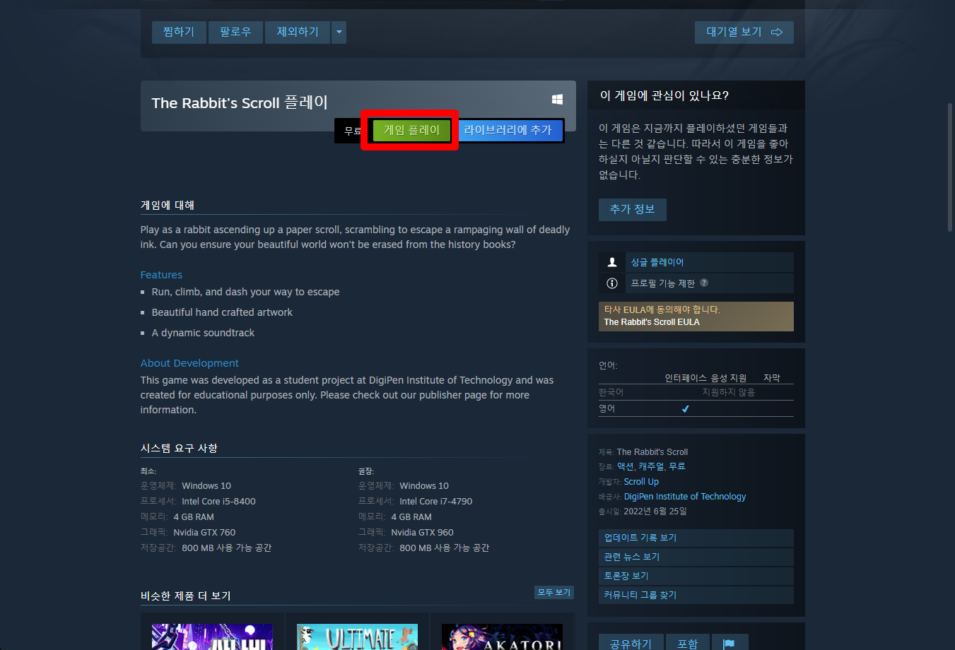 "The Rabbit's Scroll" 페이지를 내려 [게임 플레이]를 클릭하면 됩니다.