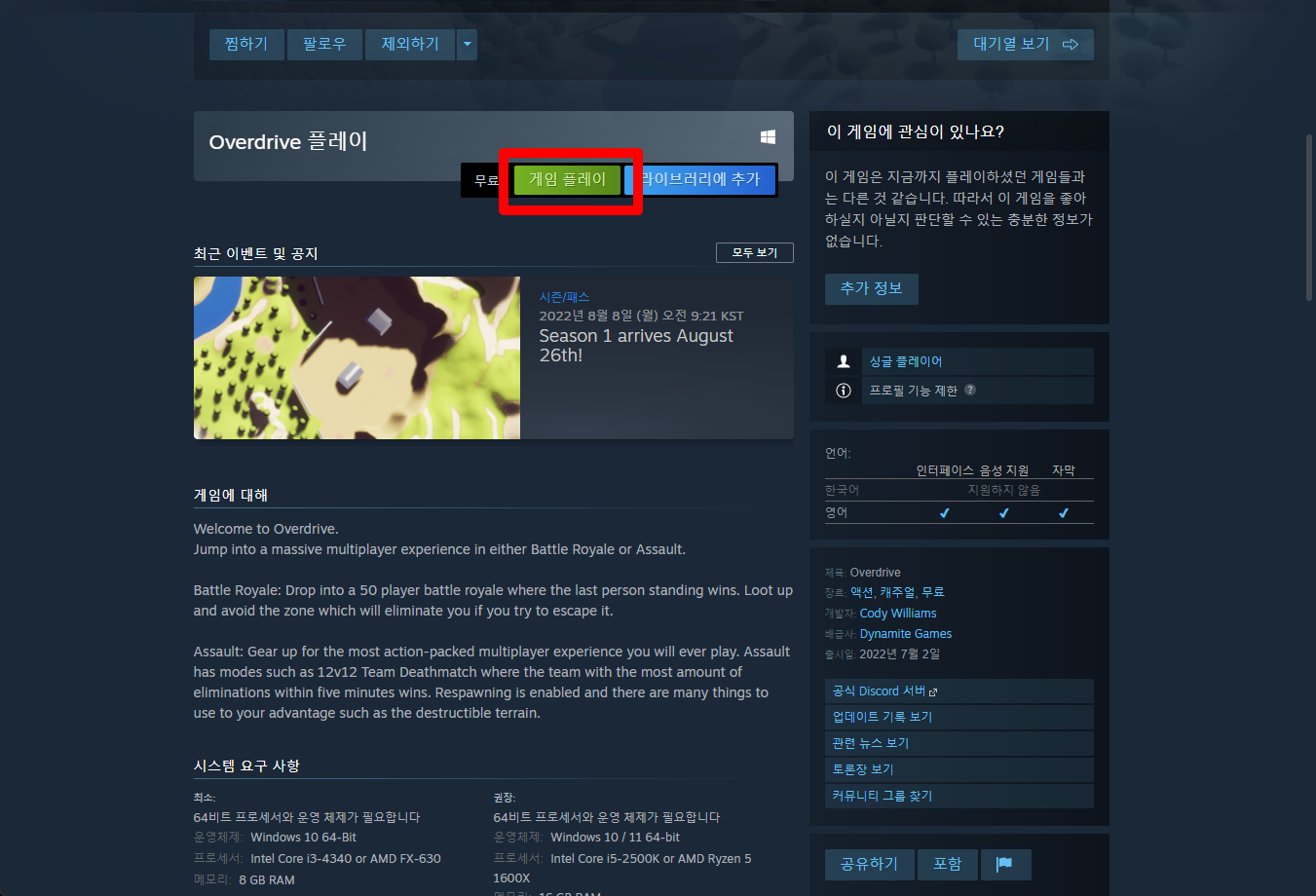 "Overdrive" 스팀 페이지 입니다.