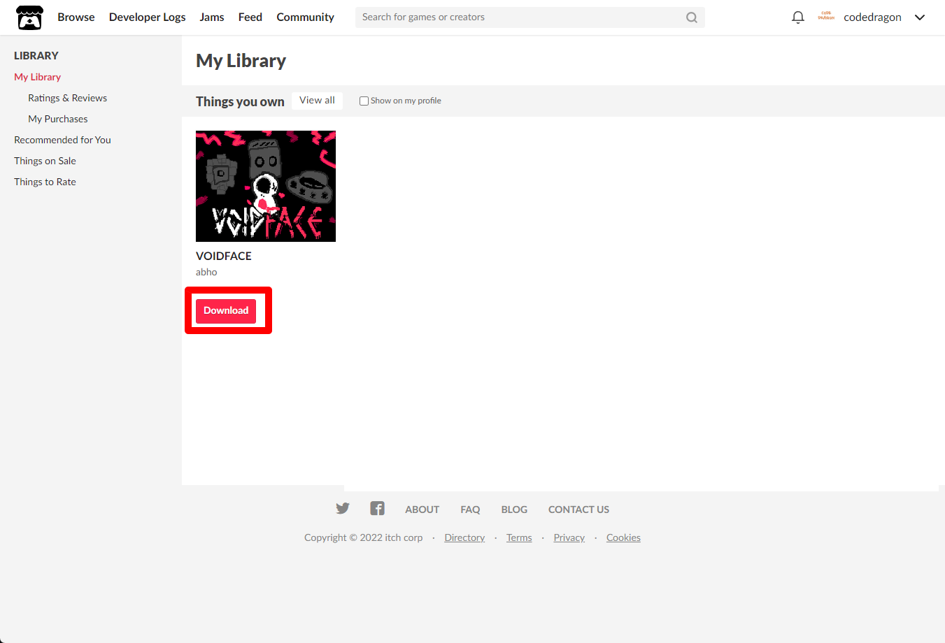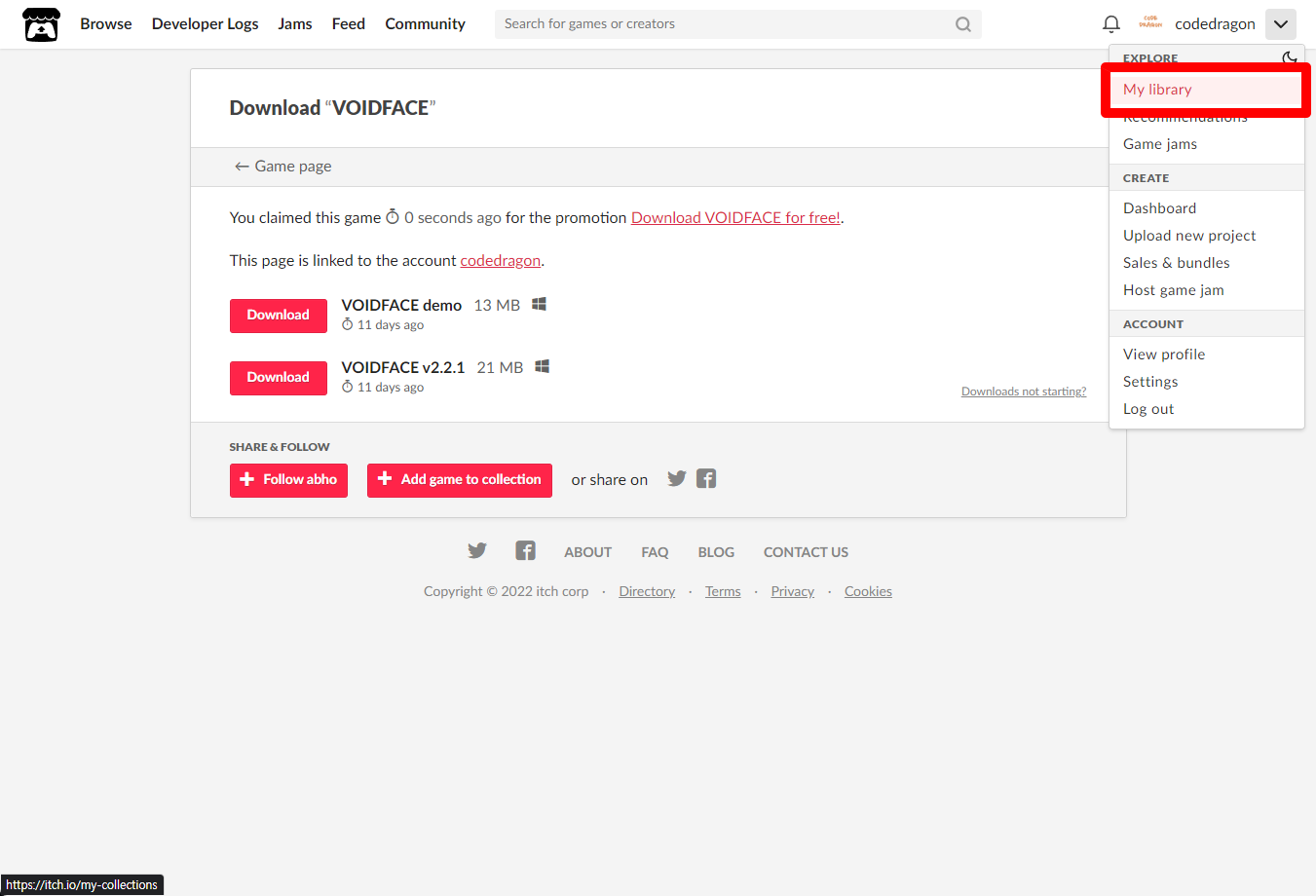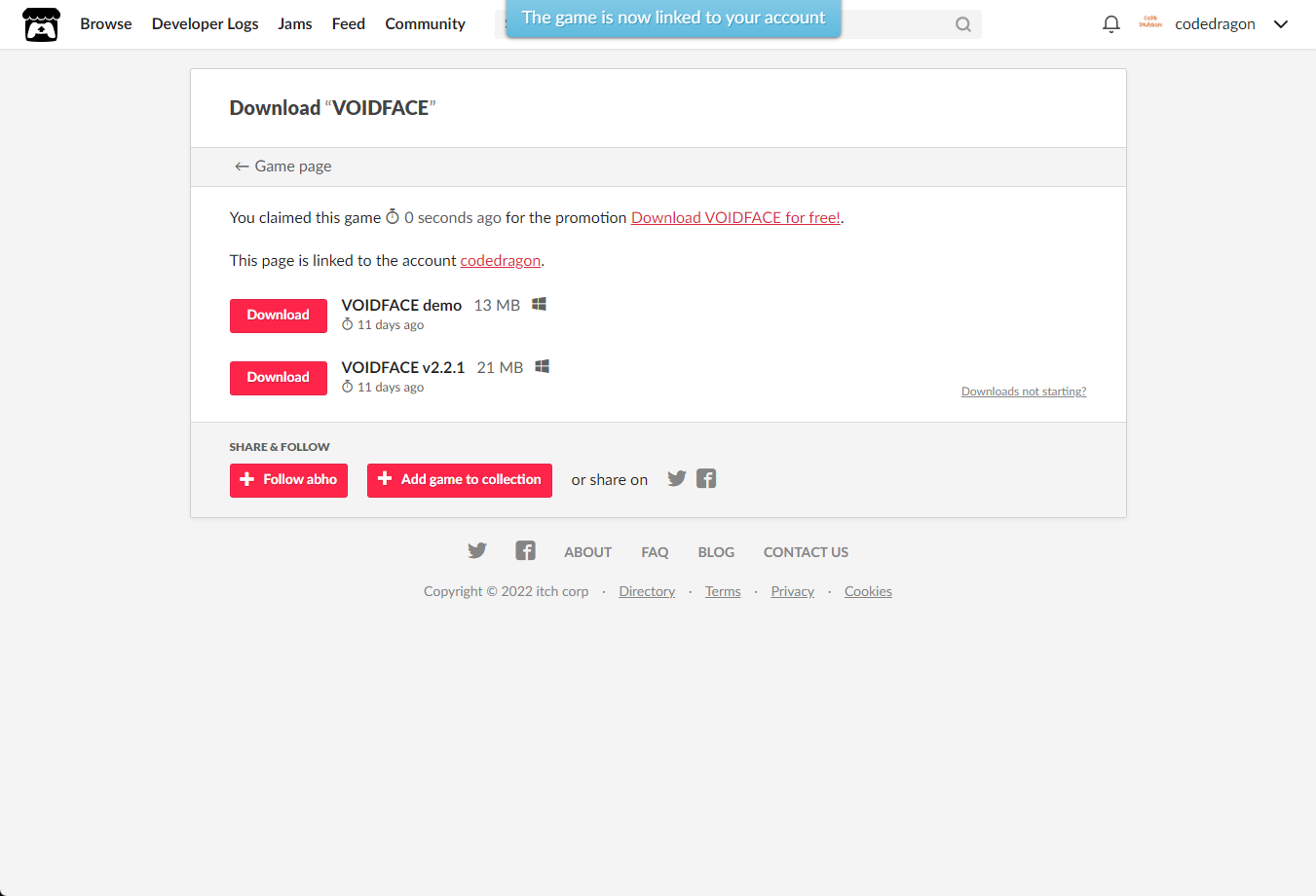 [Claim game]을 클릭하면 "VOIDFACE" 게임이 나의 게임 라이브러리에 추가되고 설치파일을 다운받을 수 있는 페이지로 이동됩니다.