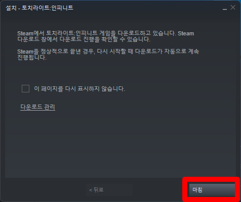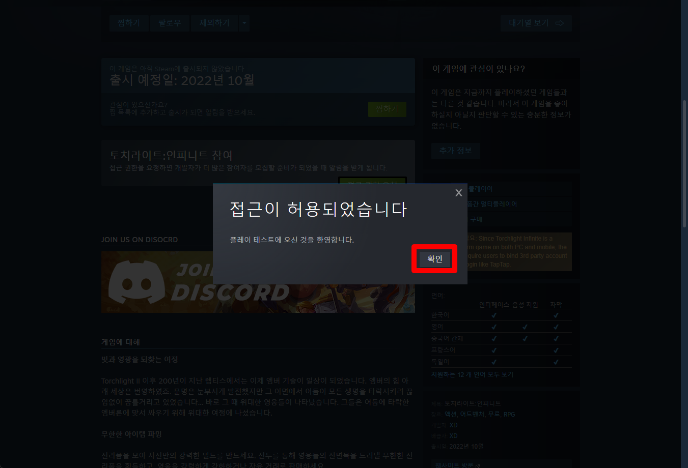 "Torchlight: Infinite" 오픈 베타에 참여되었습니다. [확인] 버튼 클릭해서 창 닫은 후 스팀 라이브러리 확인합니다.