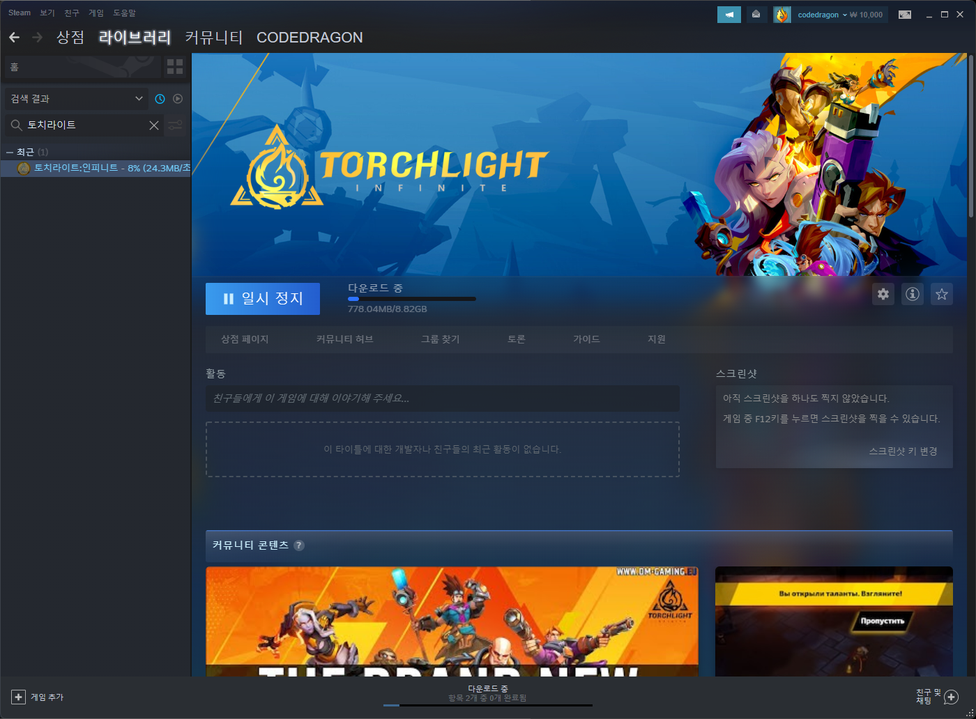 스팀런처의 상단 [라이브러리] 메뉴에서 방금 받은 "Torchlight: Infinite" 게임을 확인할 수 있습니다. [설치] 클릭해서 설치완료 후 플레이하면 됩니다.